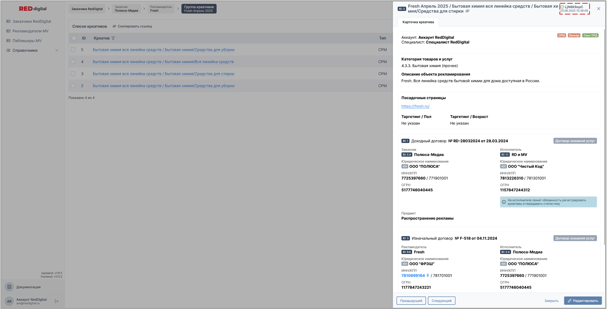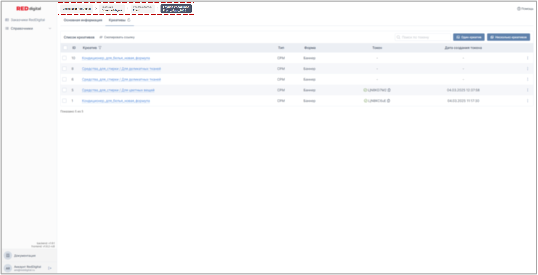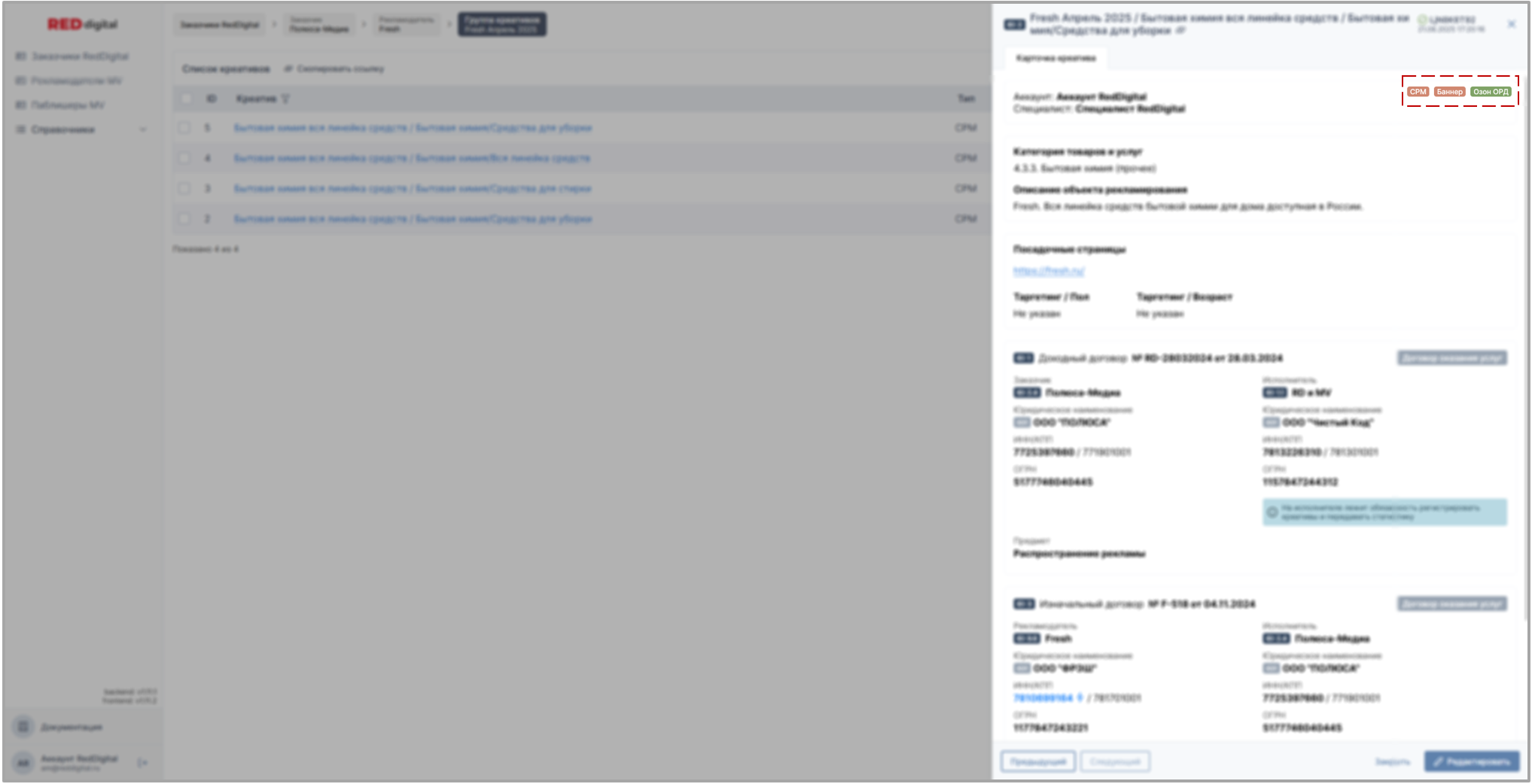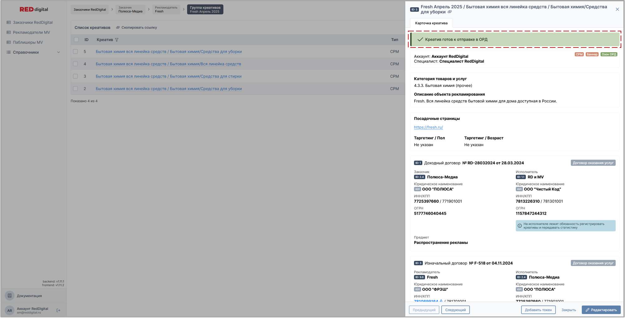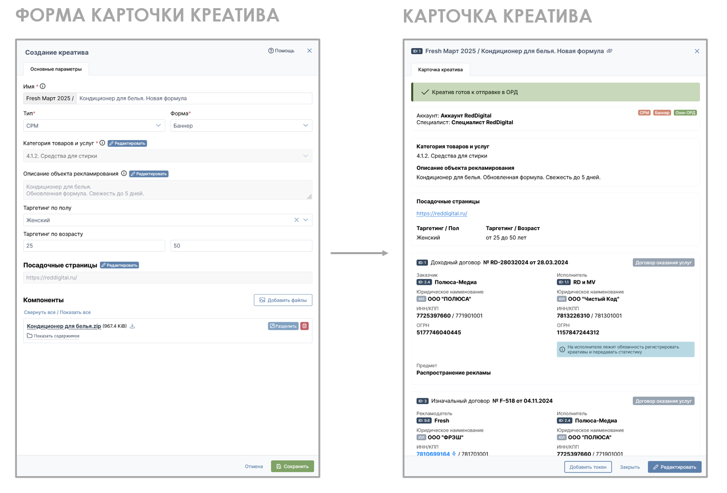 Карточка креатива - это графическое преобразование заполненной ранее формы креатива в завершенный табличный вид, со сгруппированной логически информацией, выделенными данными для удобства проверки компонента на предмет соответствия юридическим требованиям, проставленными тегами, возможностью быстрого перехода от одного креатива группы к другому при наличии, уведомлениями от системы о готовности или не готовности к отправке в ОРД, кнопками Получения или Добавления токена, кнопкой перехода в режим редактирования.
