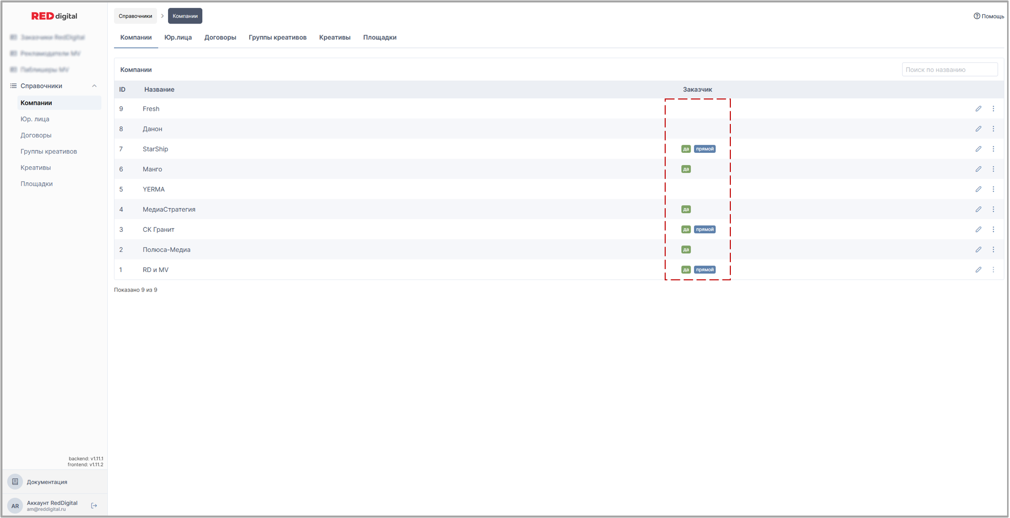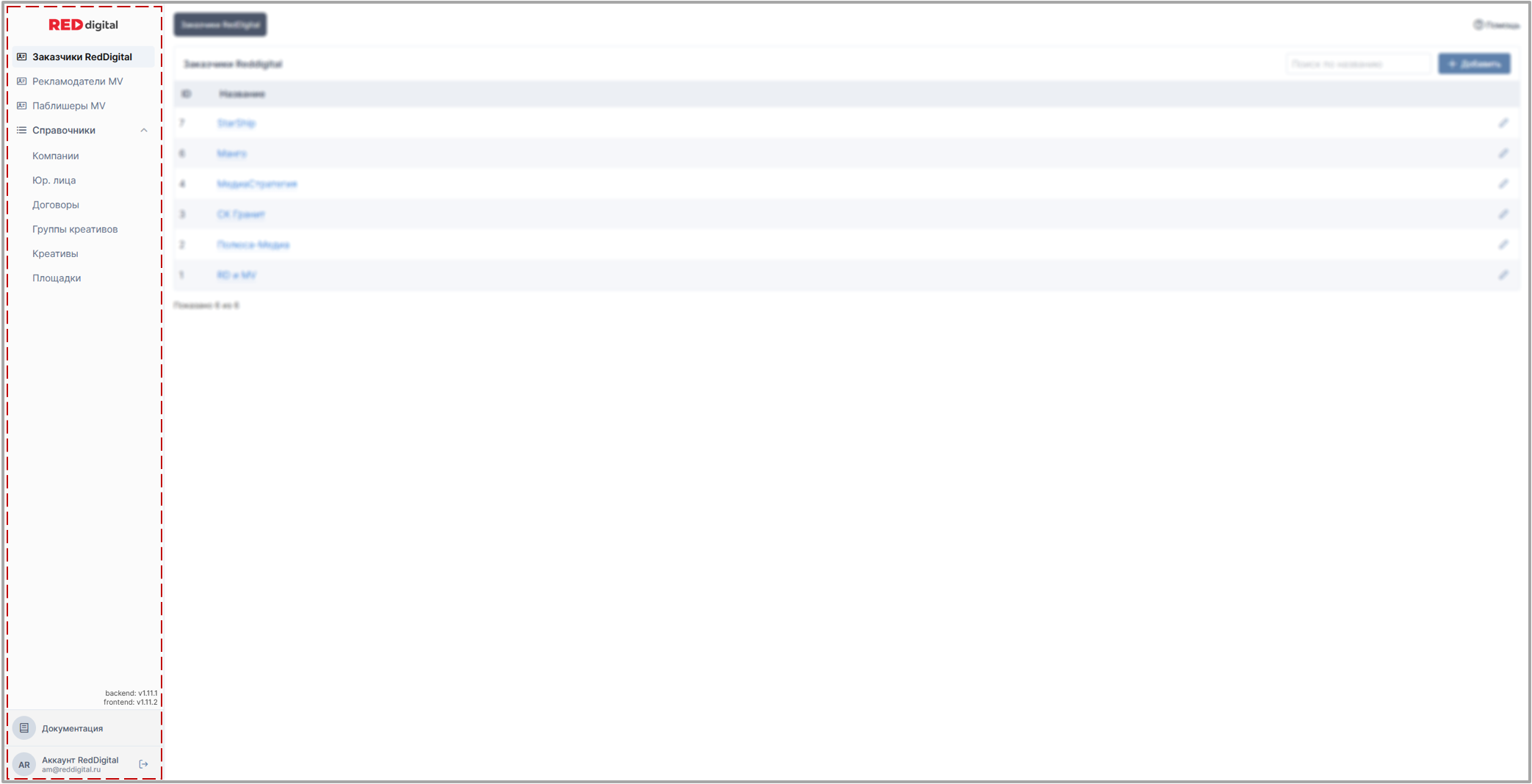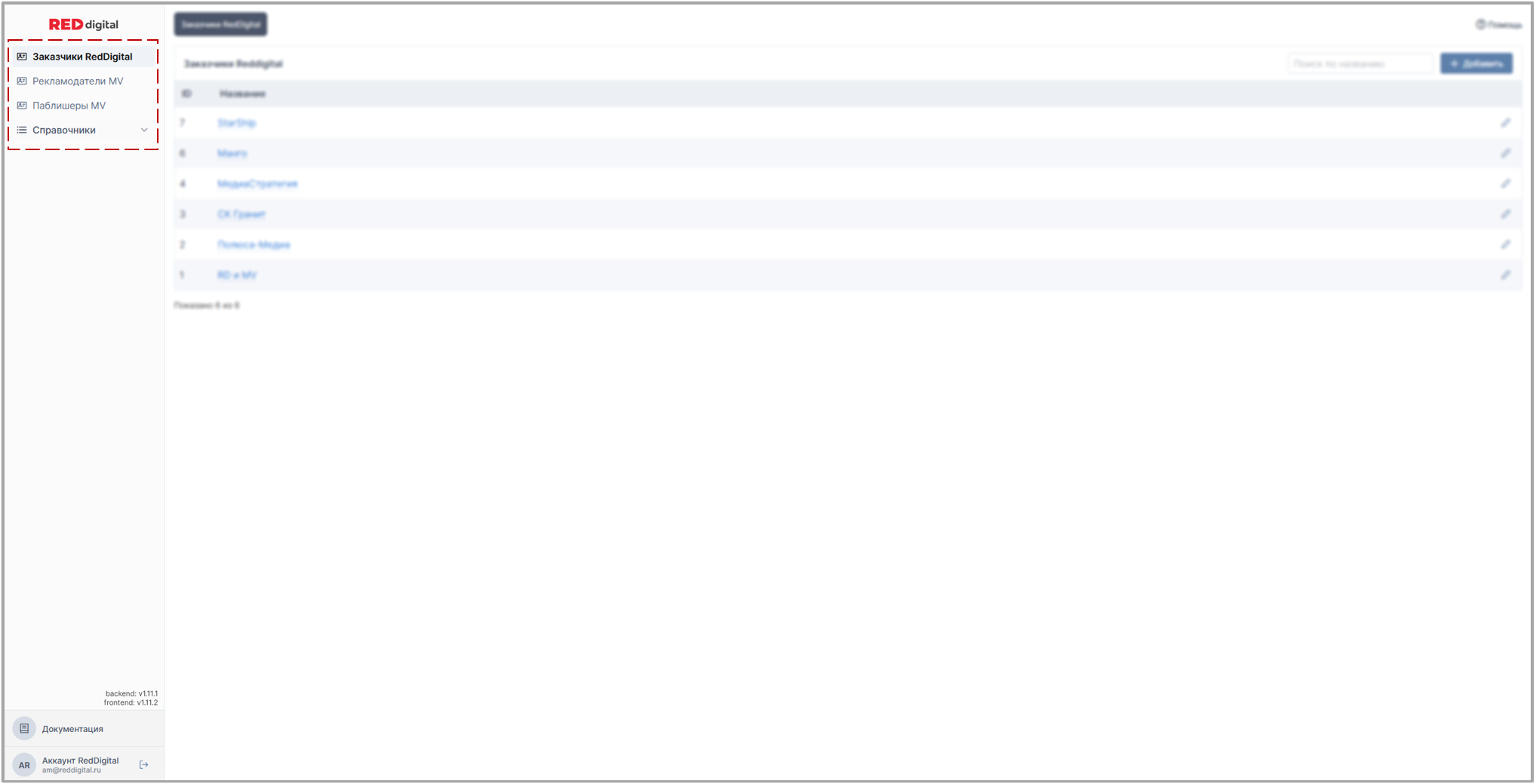 - Кнопка перехода в раздел Заказчики RedDigital представленная в виде стартовой страницы по умолчанию.