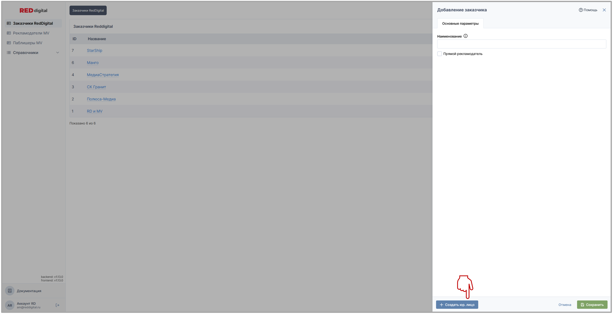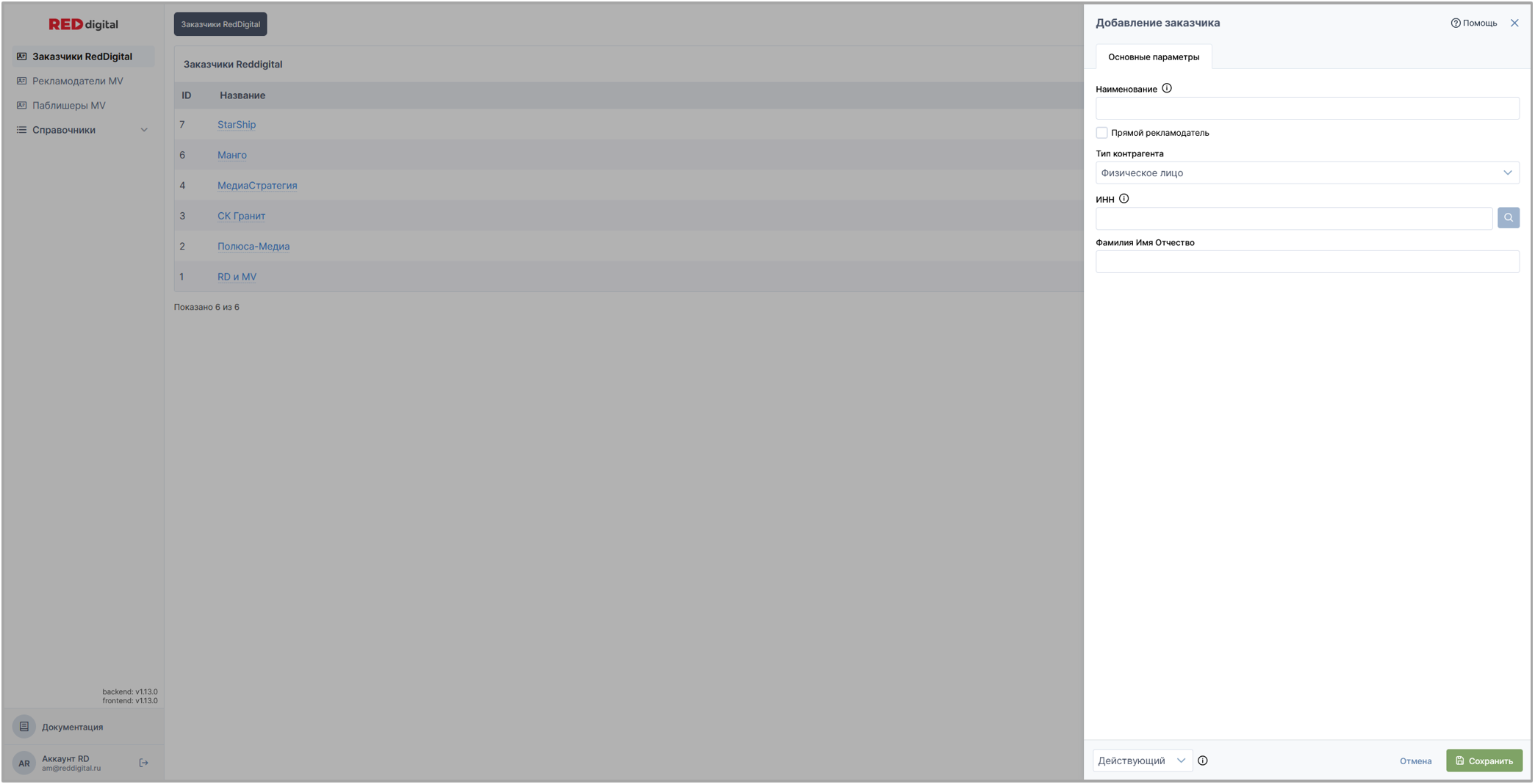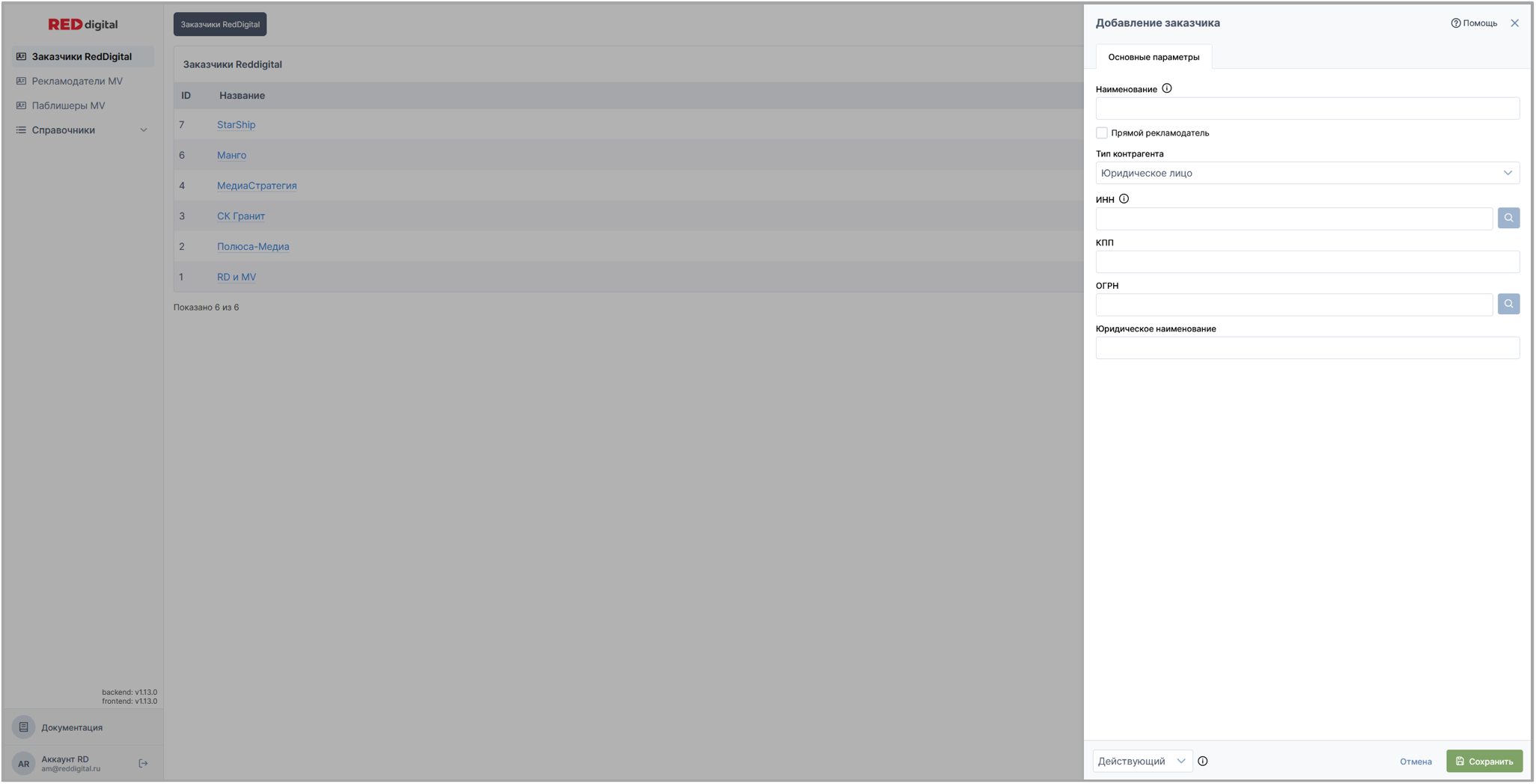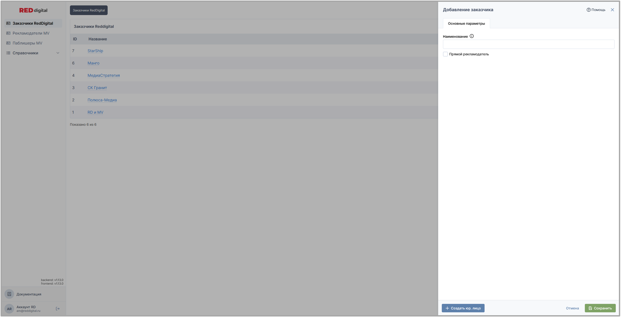 Вкладка представляет собой список, состоящий из всех заказчиков всех юридических лиц RED digital.