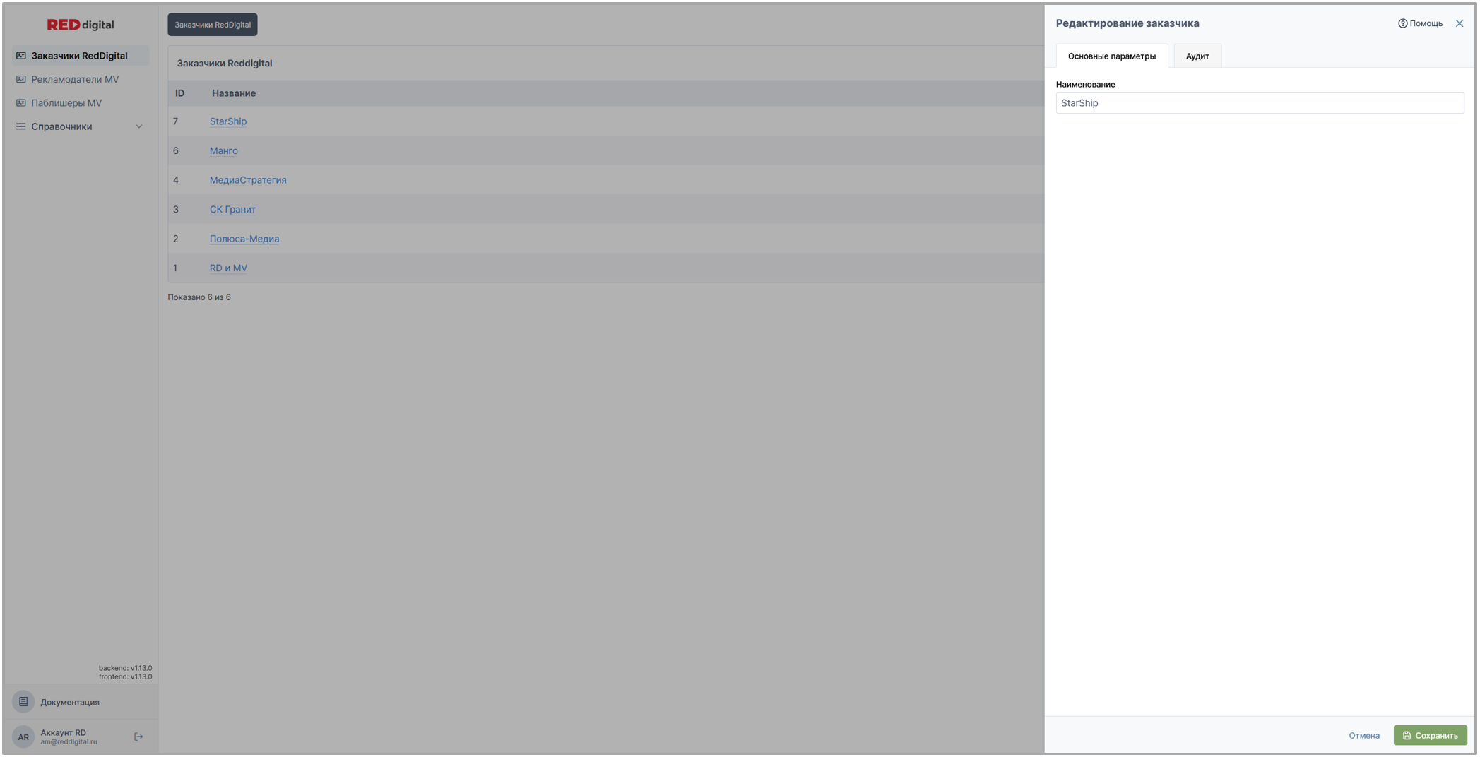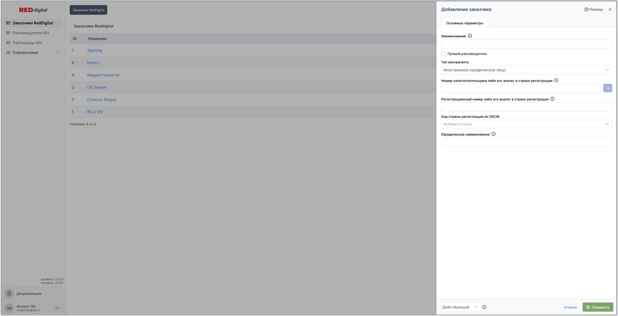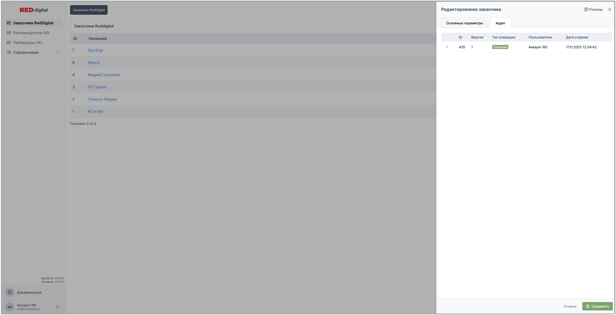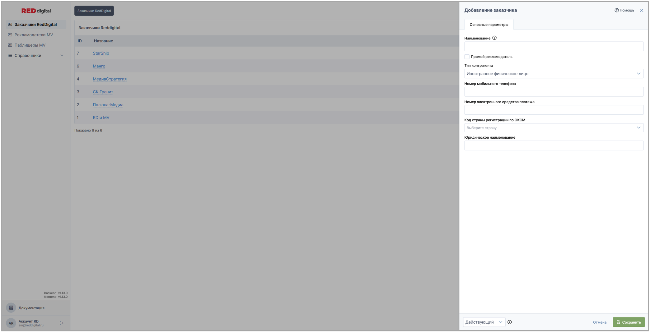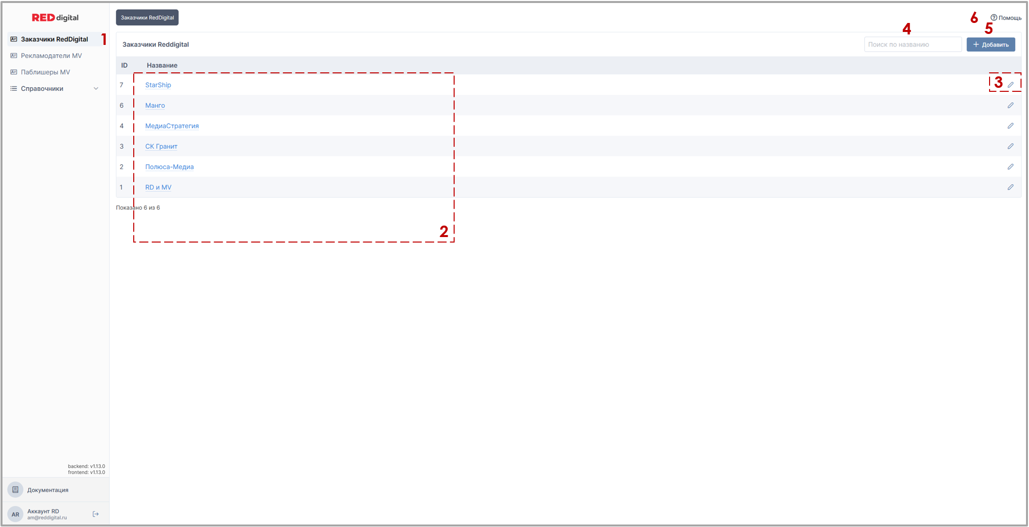 Вкладка представляет собой список, состоящий из всех заказчиков всех юридических лиц RED digital.