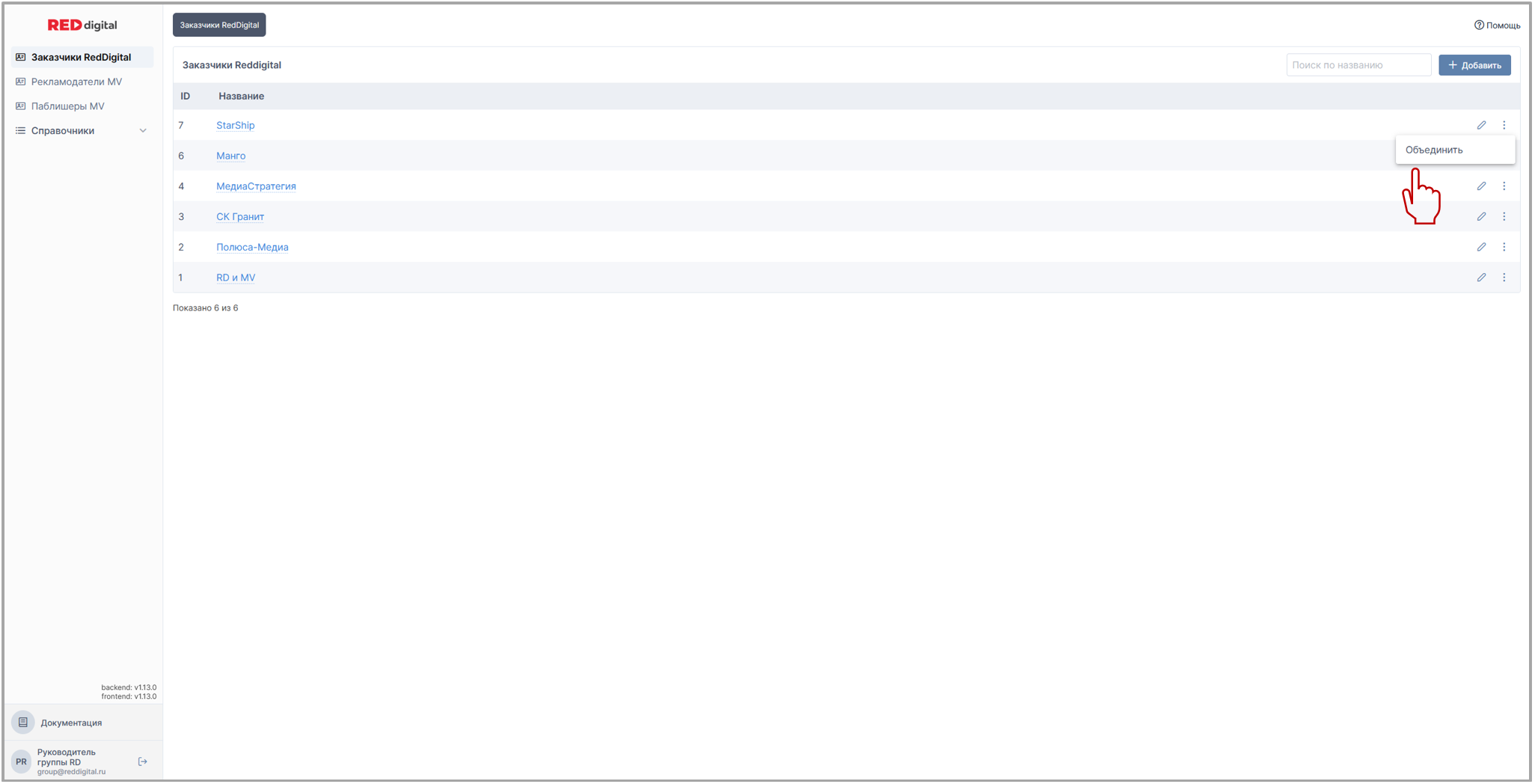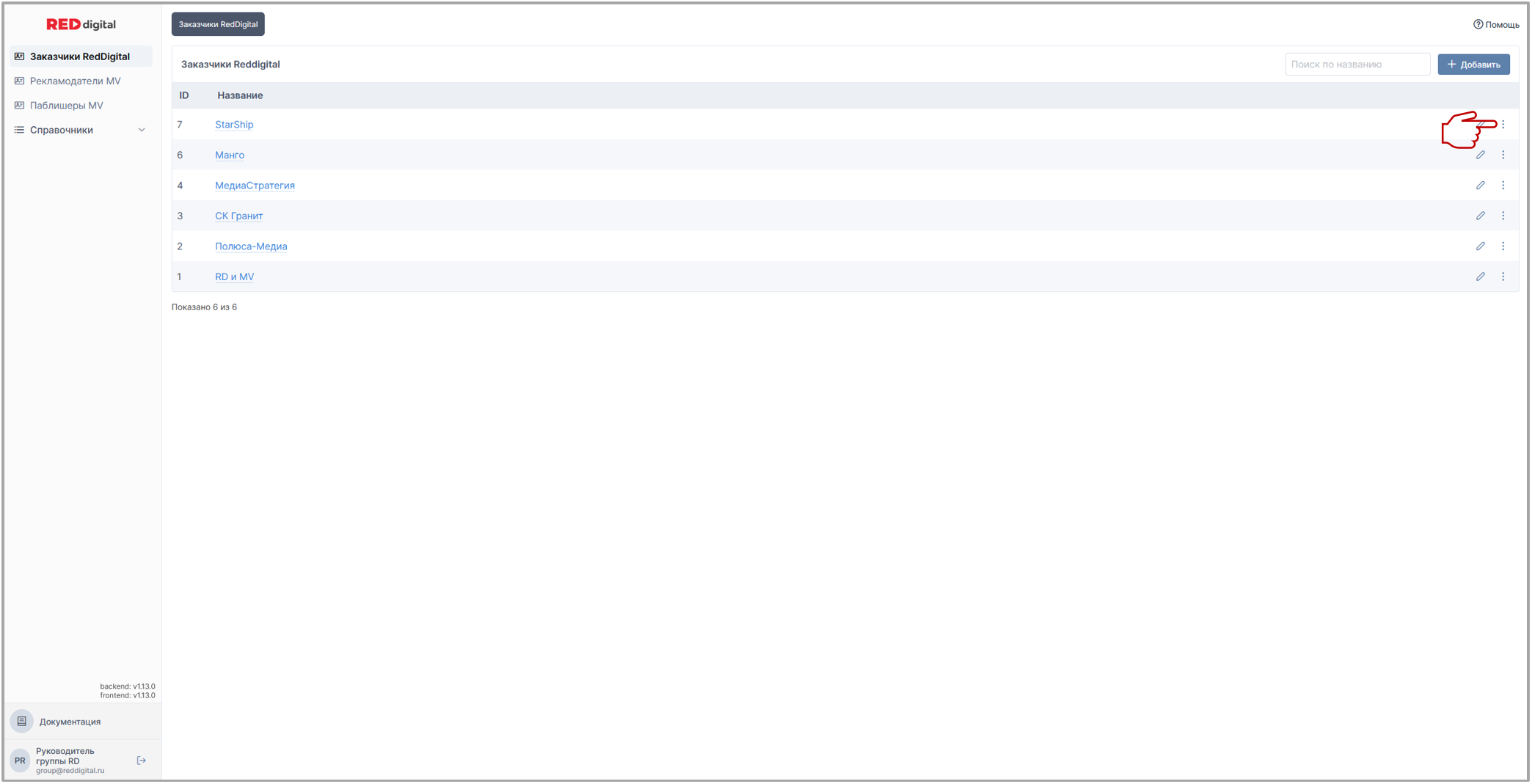 Наличие кнопки 🚦 контекстного меню во вкладке Заказчики RedDigital определяют права пользователя. Данная функция доступна руководителю клиентской группы.