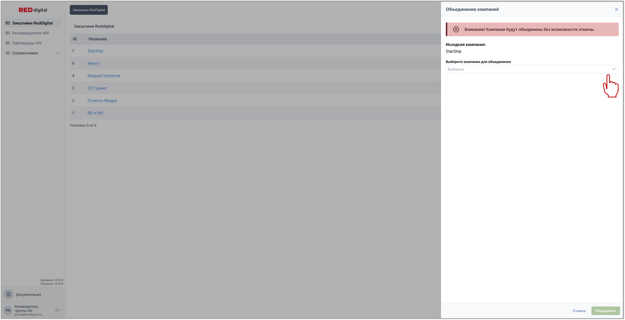 Кнопка Объединить присоединяет одну компанию к другой.