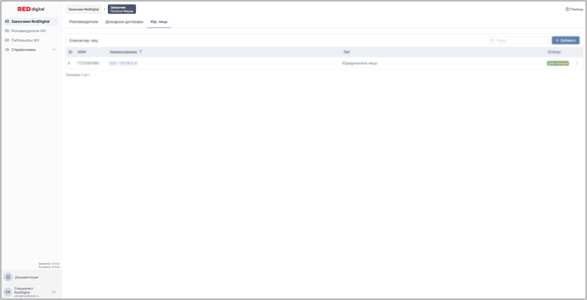 Эта вкладка со списком всех юридических лиц которые являются заказчиками по договорам с Red Digital внутри компании в которой находится пользователь.