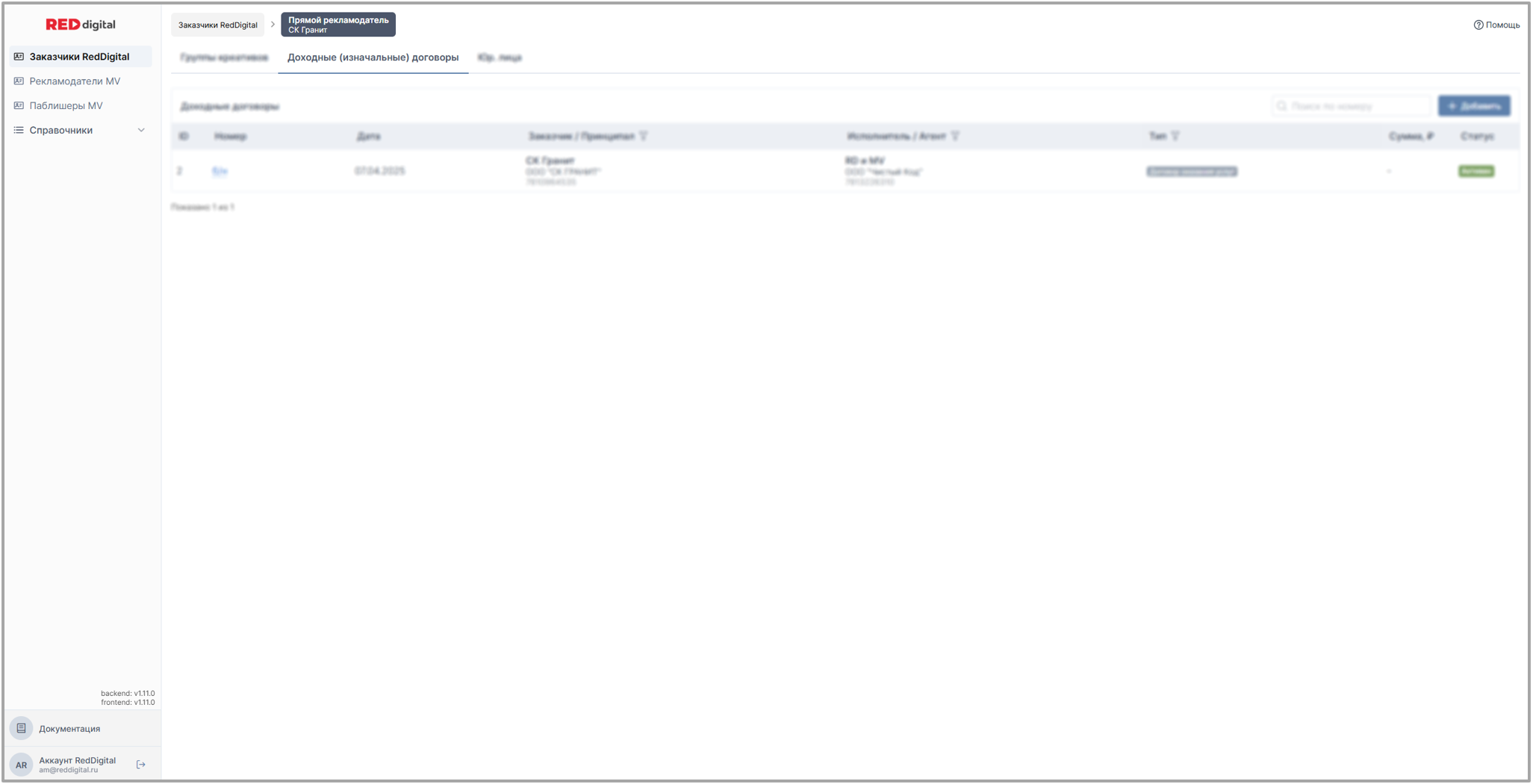Вкладка раздела Заказчики Red Digital со списком всех доходных (изначальных) договоров внутри компании в котороой находится пользователь.