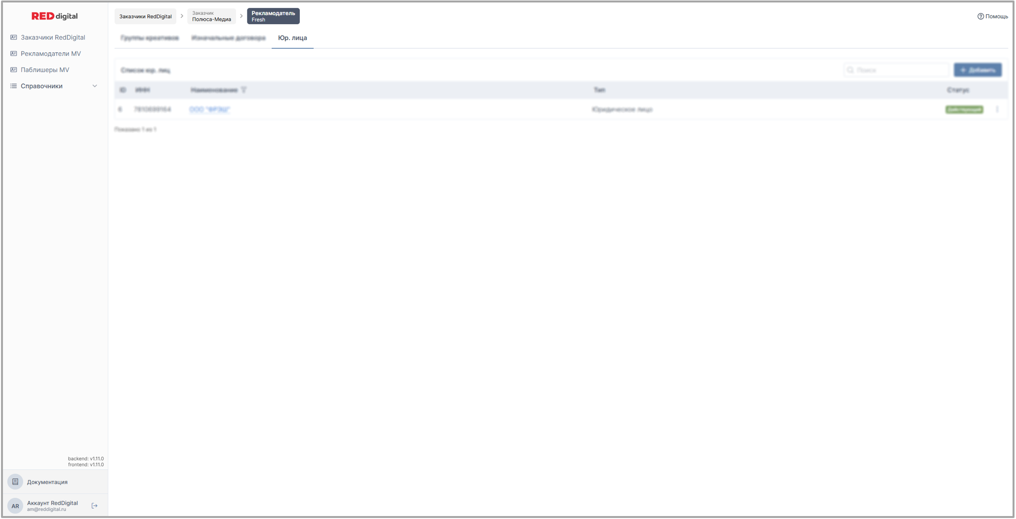 Эта вкладка со списком всех юридических лиц которые являются заказчиками по изначальным договорам внутри компании в которой находится пользователь.