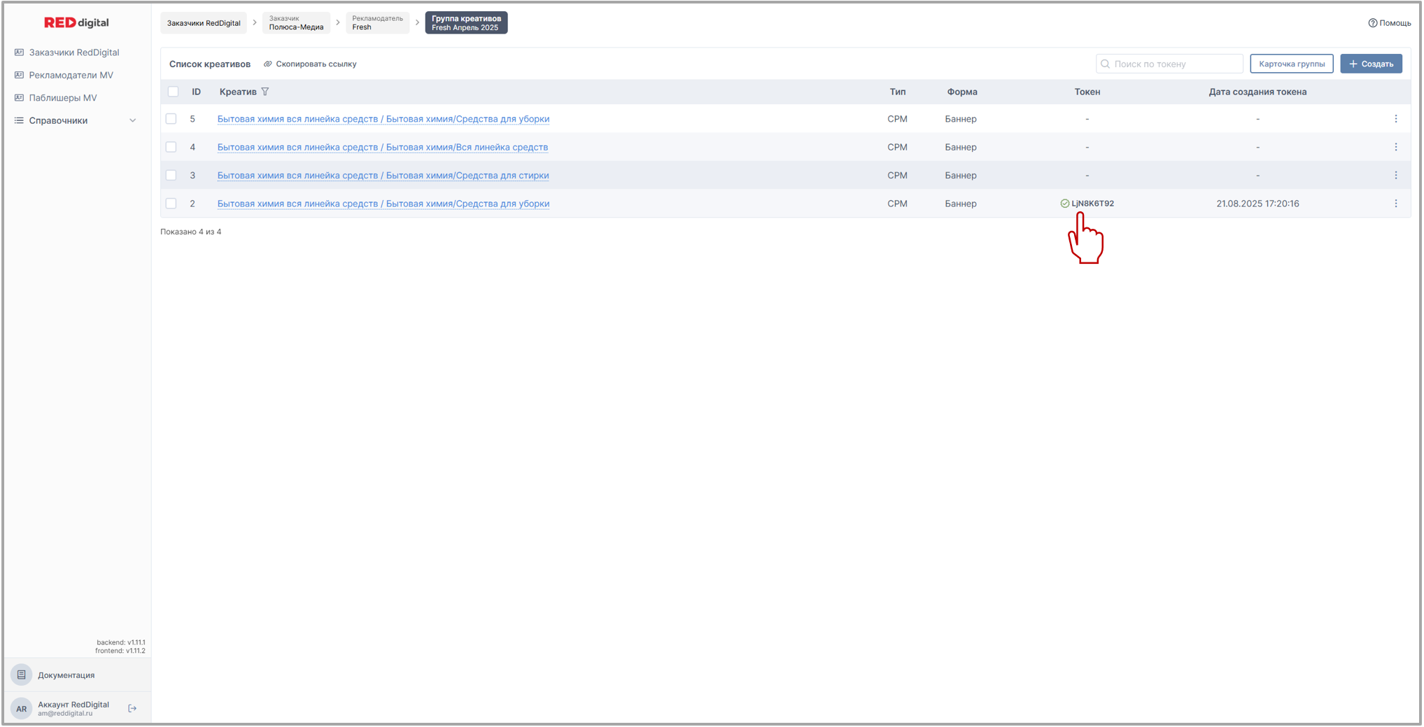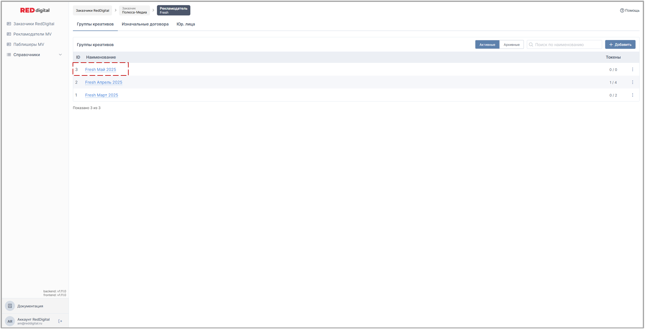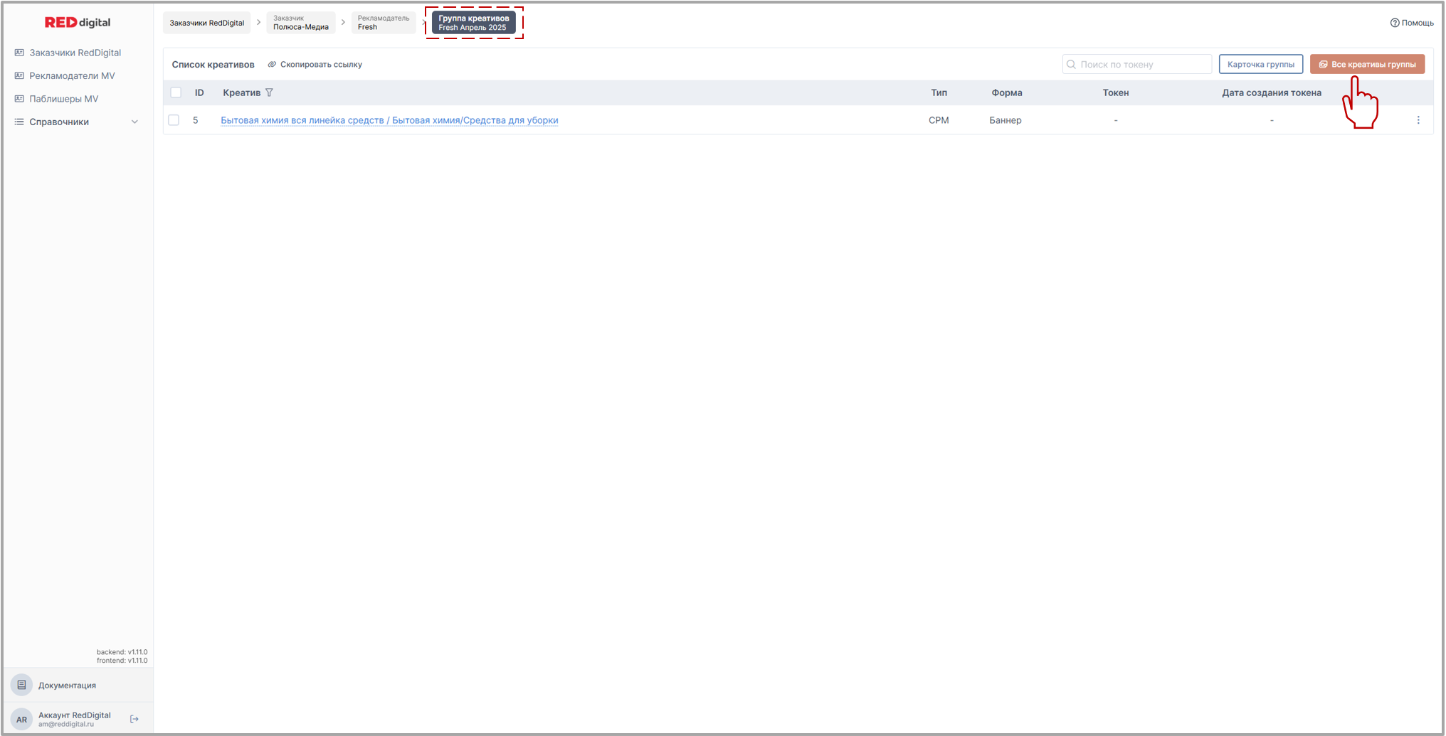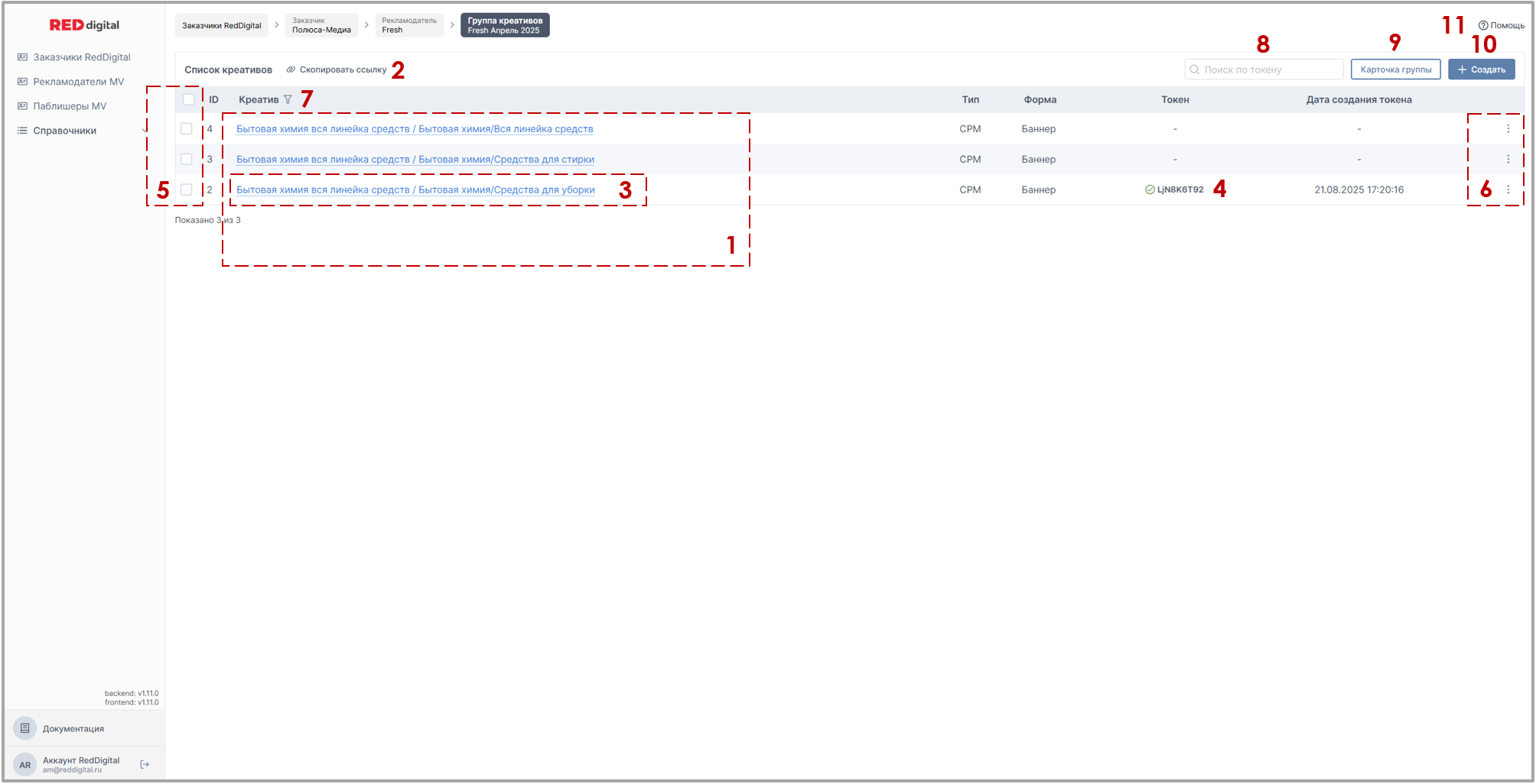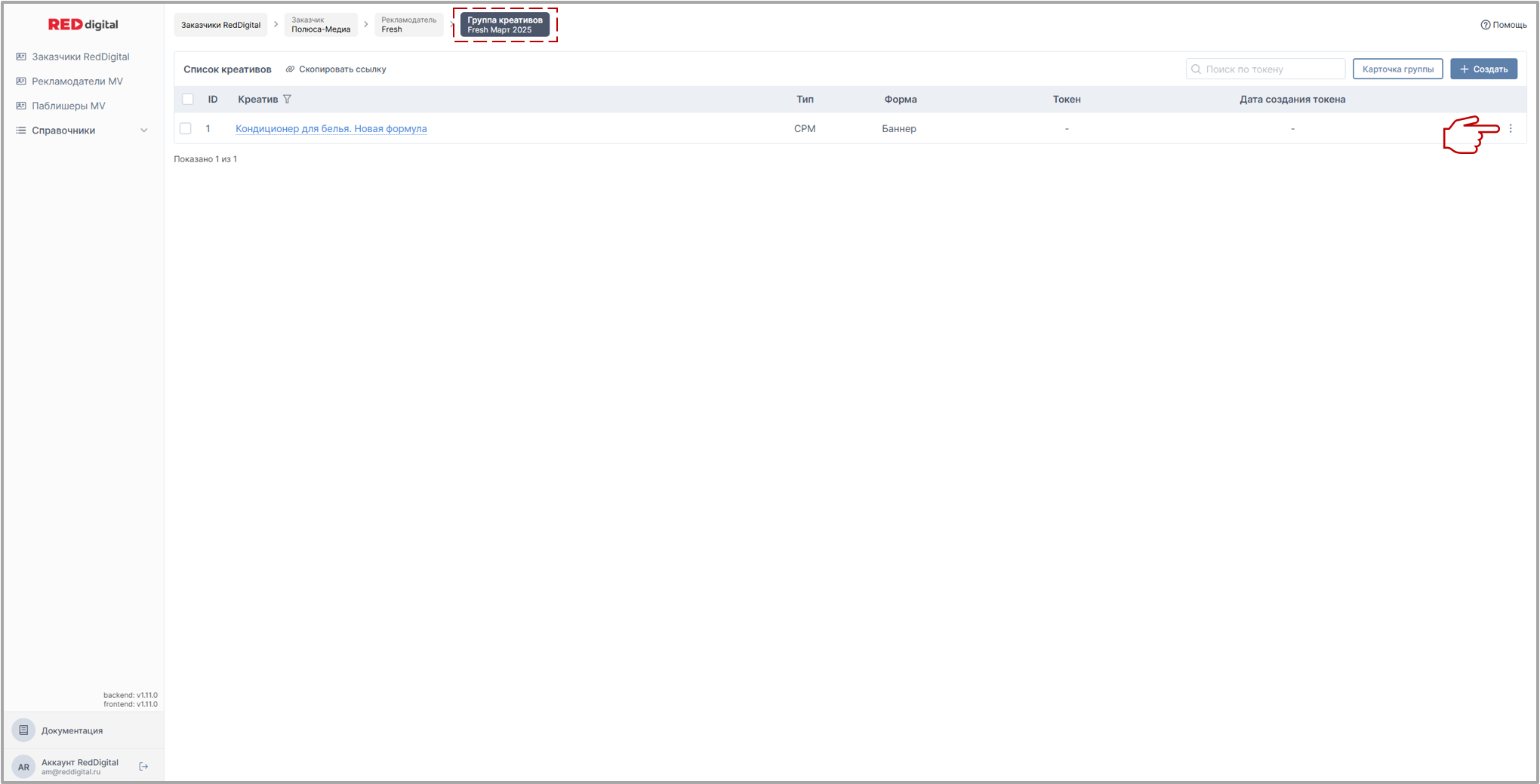 Вкладка Креативы представляет собой список креативов группы внутри которой находится пользователь.