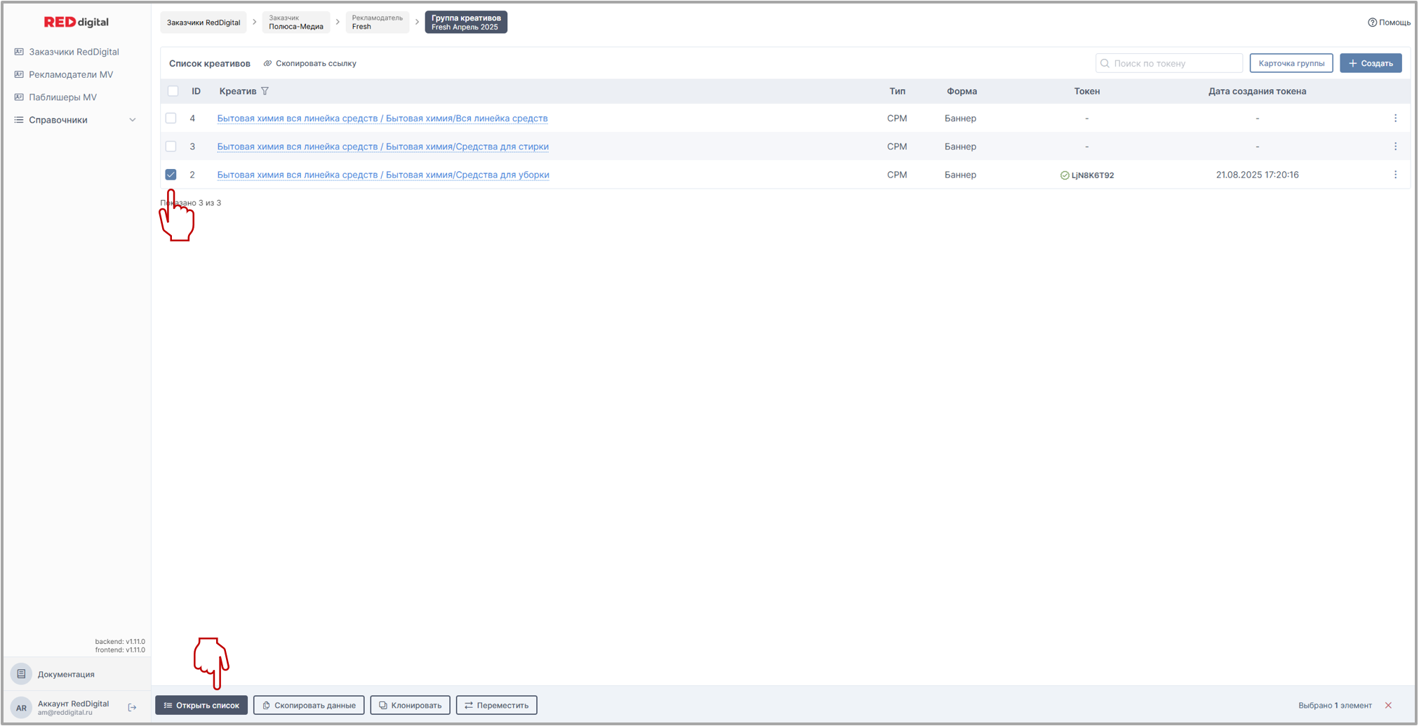 - Проставление отметки ☑ выбранных креативов вызывает всплывающую панель в футере с дополнительным функционалом. Кнопка Открыть список формирует креативы с проставленными отметками в отдельный список.