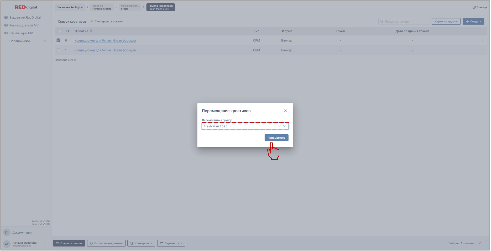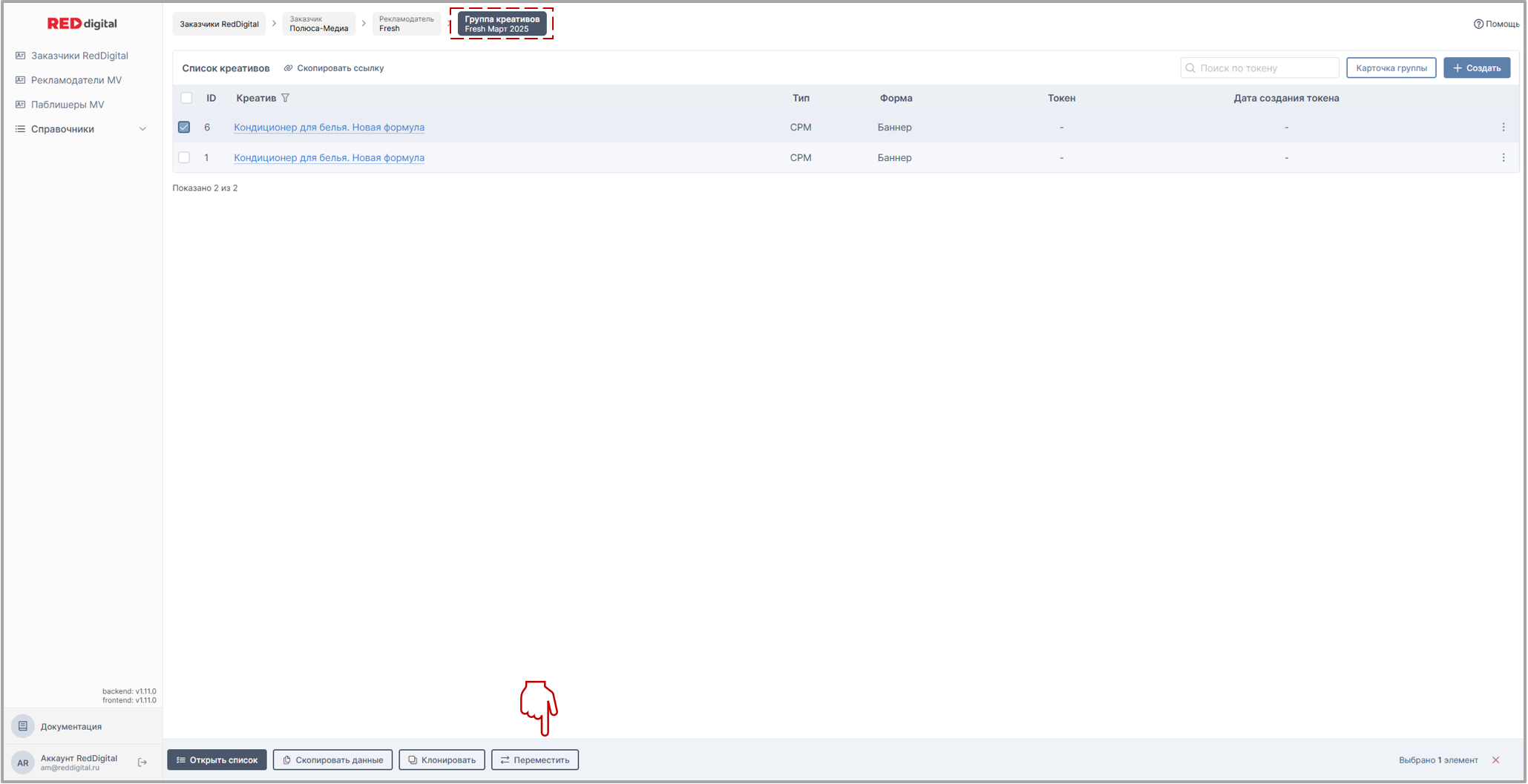 - Проставление отметки ☑ выбранных креативов вызывает всплывающую панель в футере с дополнительным функционалом. Кнопка 🔄 Переместить переносит в выбранную в выпадающем списке группу.