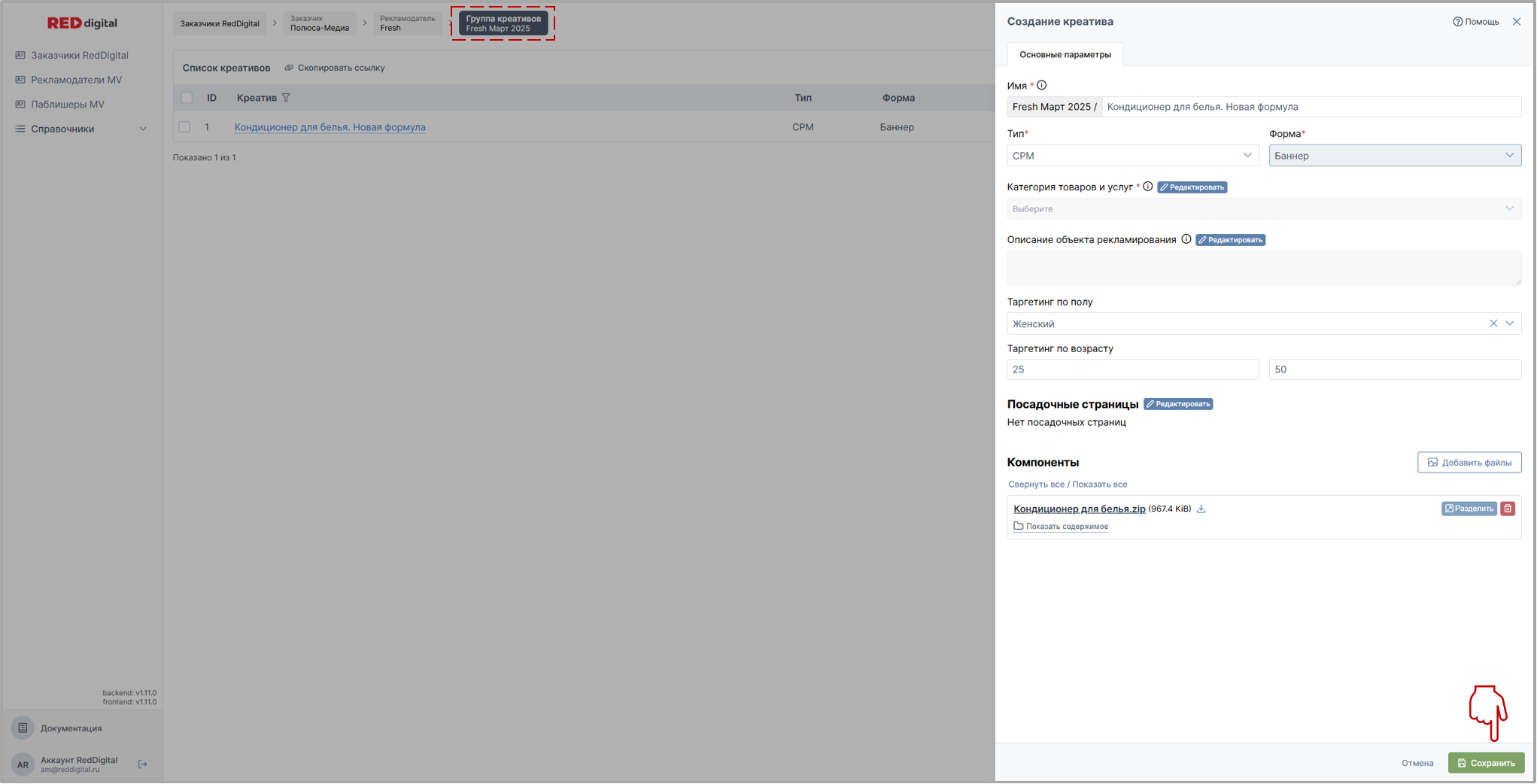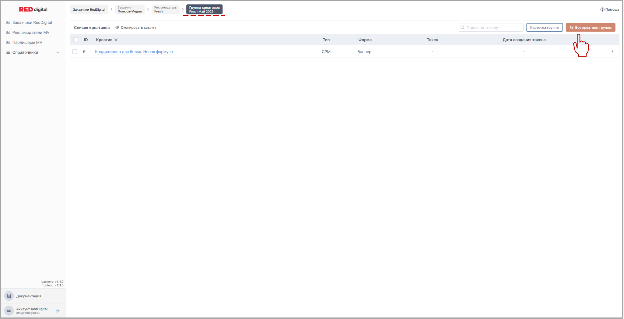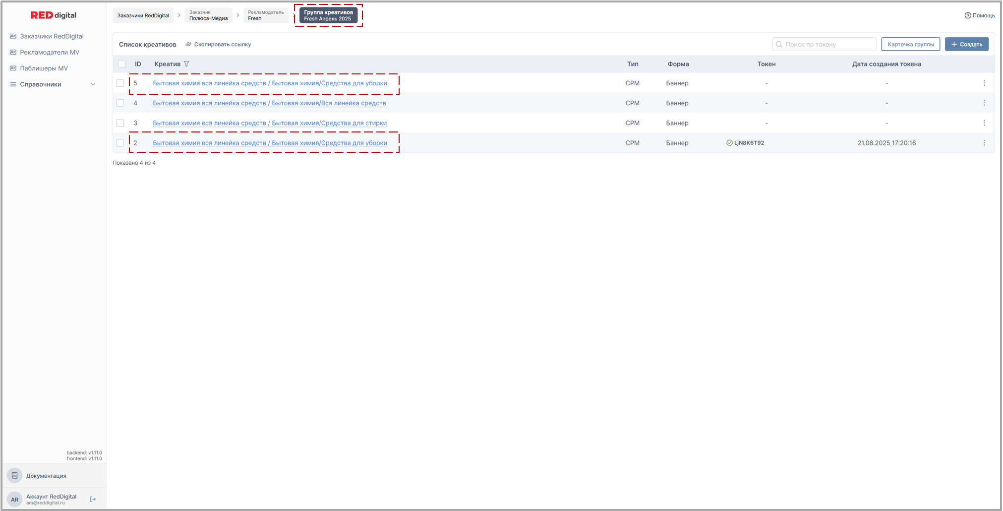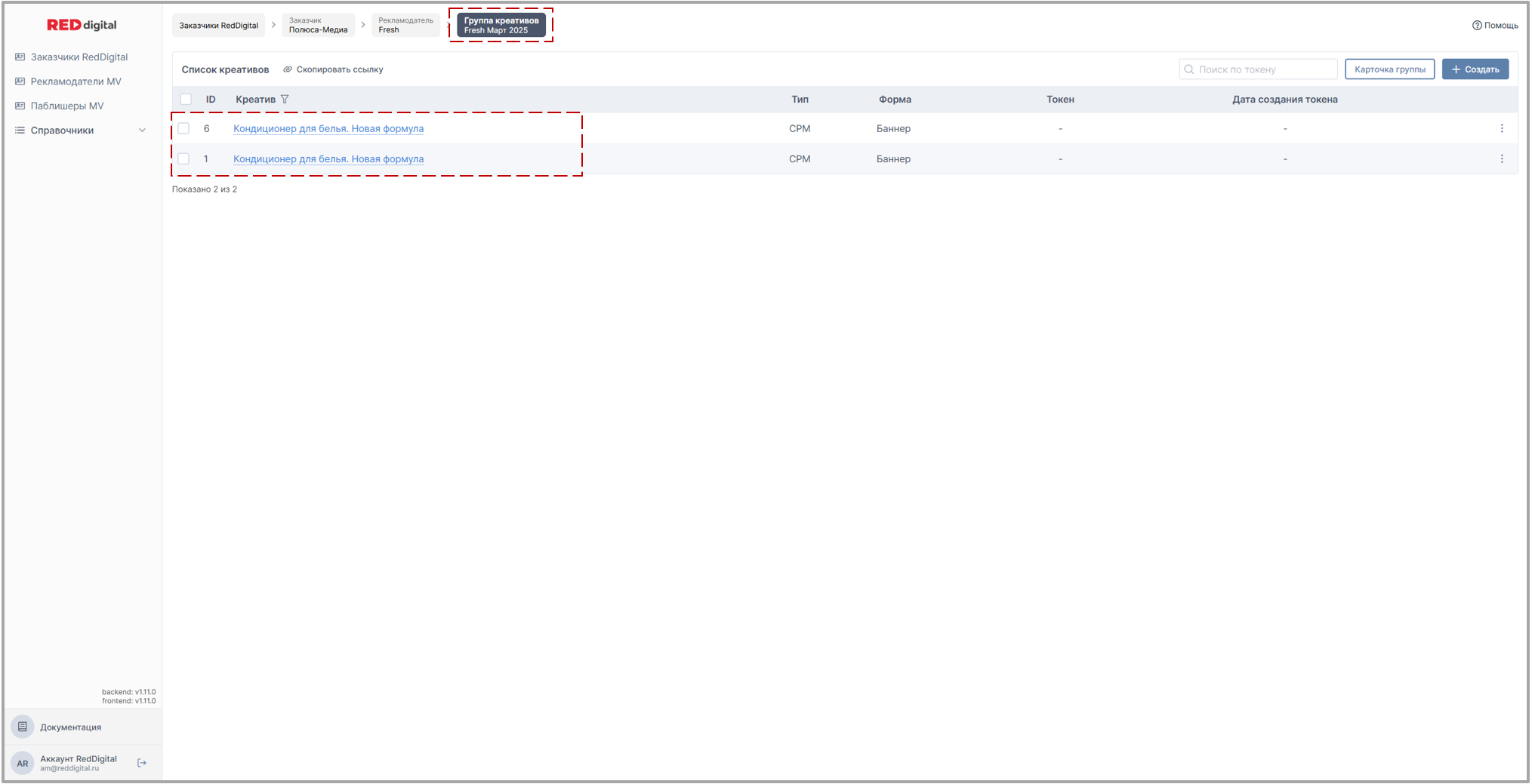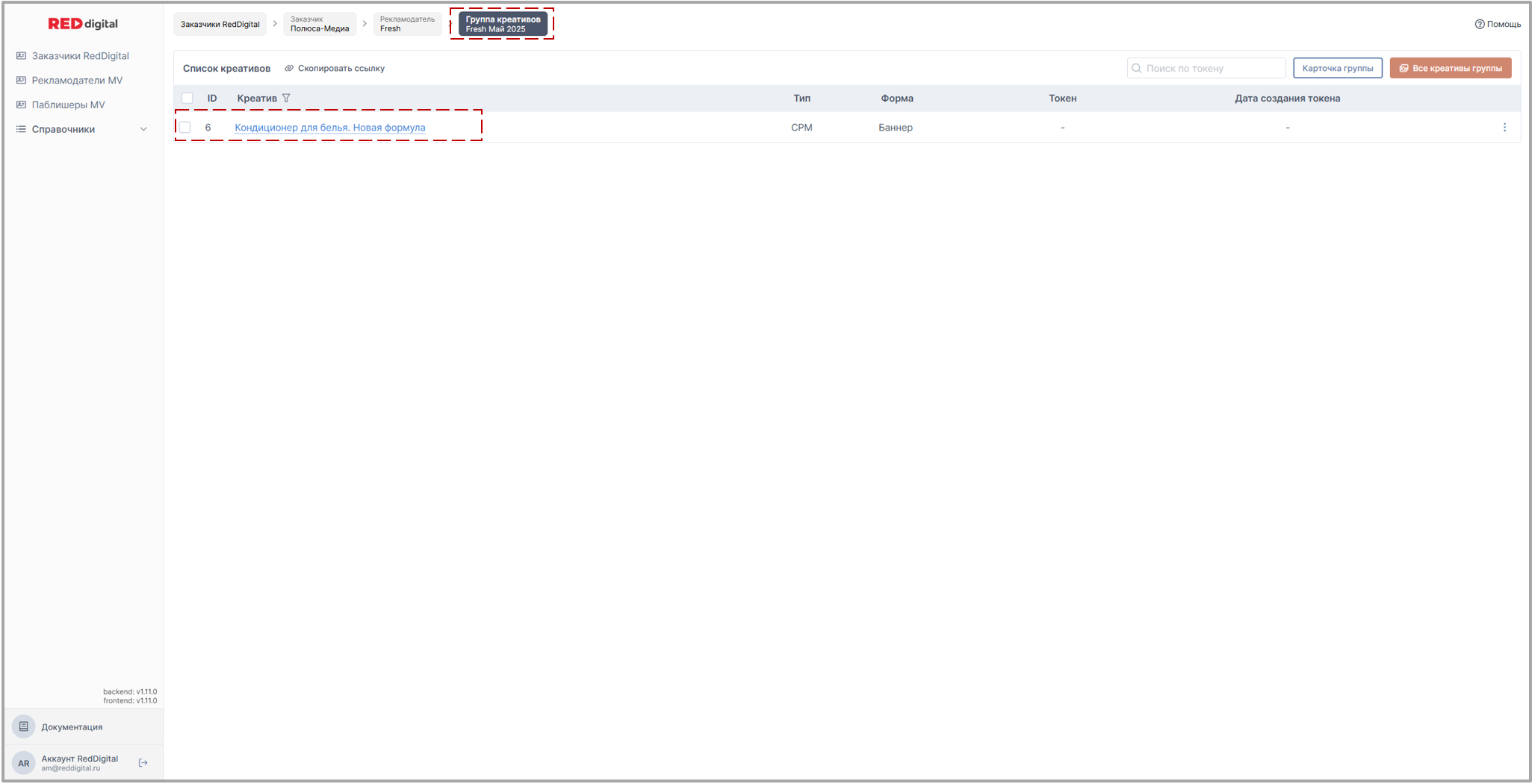 - Перемещенные креативы открываются отдельным списком внутри новой группы.