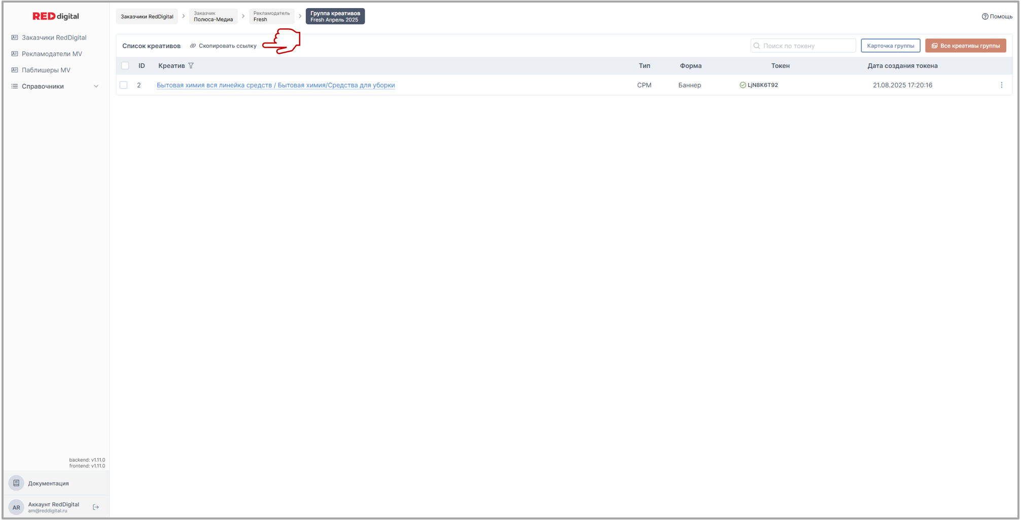 Кнопка ⿻ Скопировать ссылку сохраняет список выбранных креативов для последующей вставки в документ или мессенджер стандартным сочетанием клавиш ctrl+v.