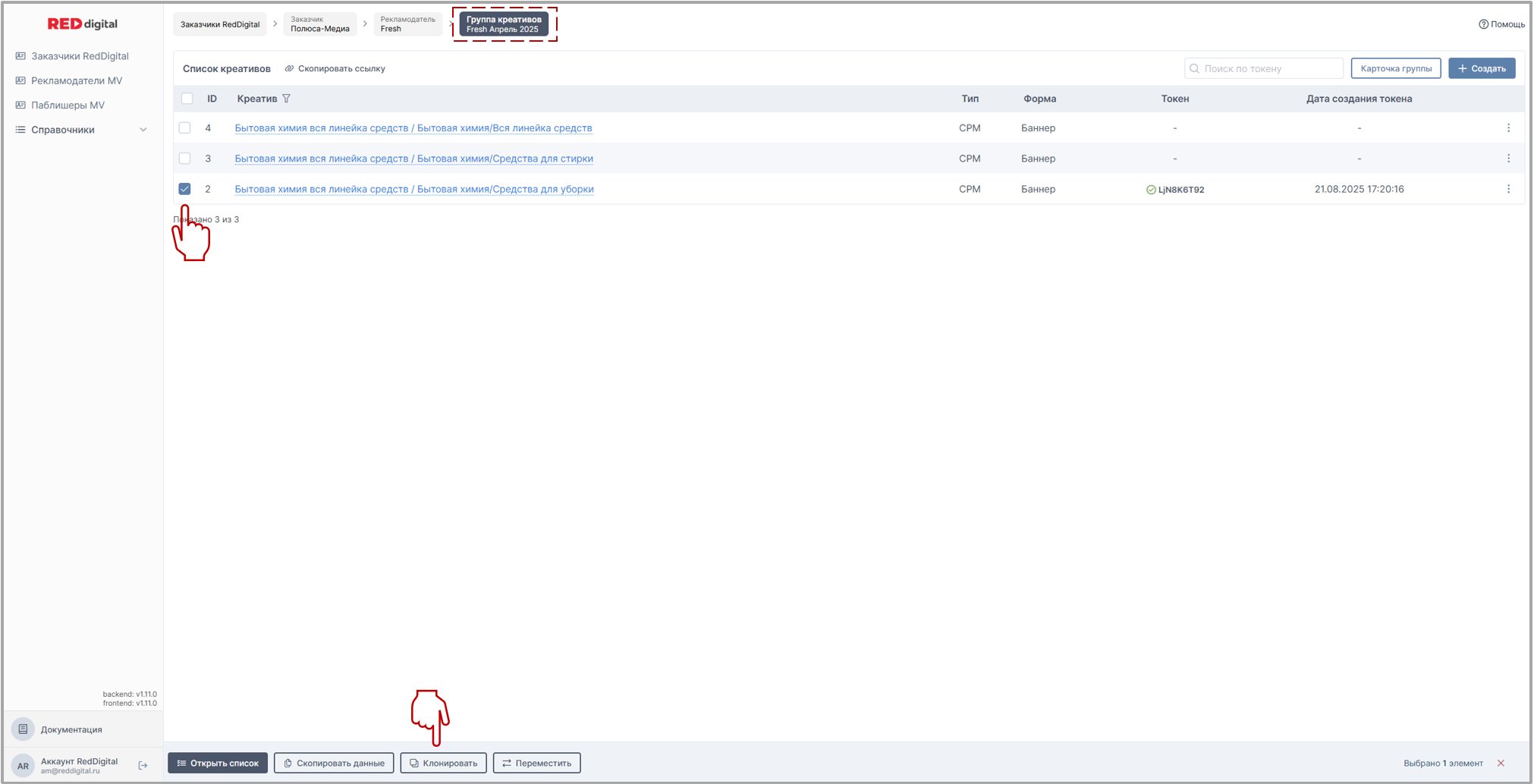 - Проставление отметки ☑ выбранных креативов вызывает всплывающую панель в футере с дополнительным функционалом. Кнопка ⿻ Скопировать данные копирует данные креатива (бренд рекламодателя, название группы креативов, название креатива, токен или его отсутствие) в буфер для последующей вставки в документ (word, excel и их аналоги NAS, блокнот, мессенджер или АСПРО).