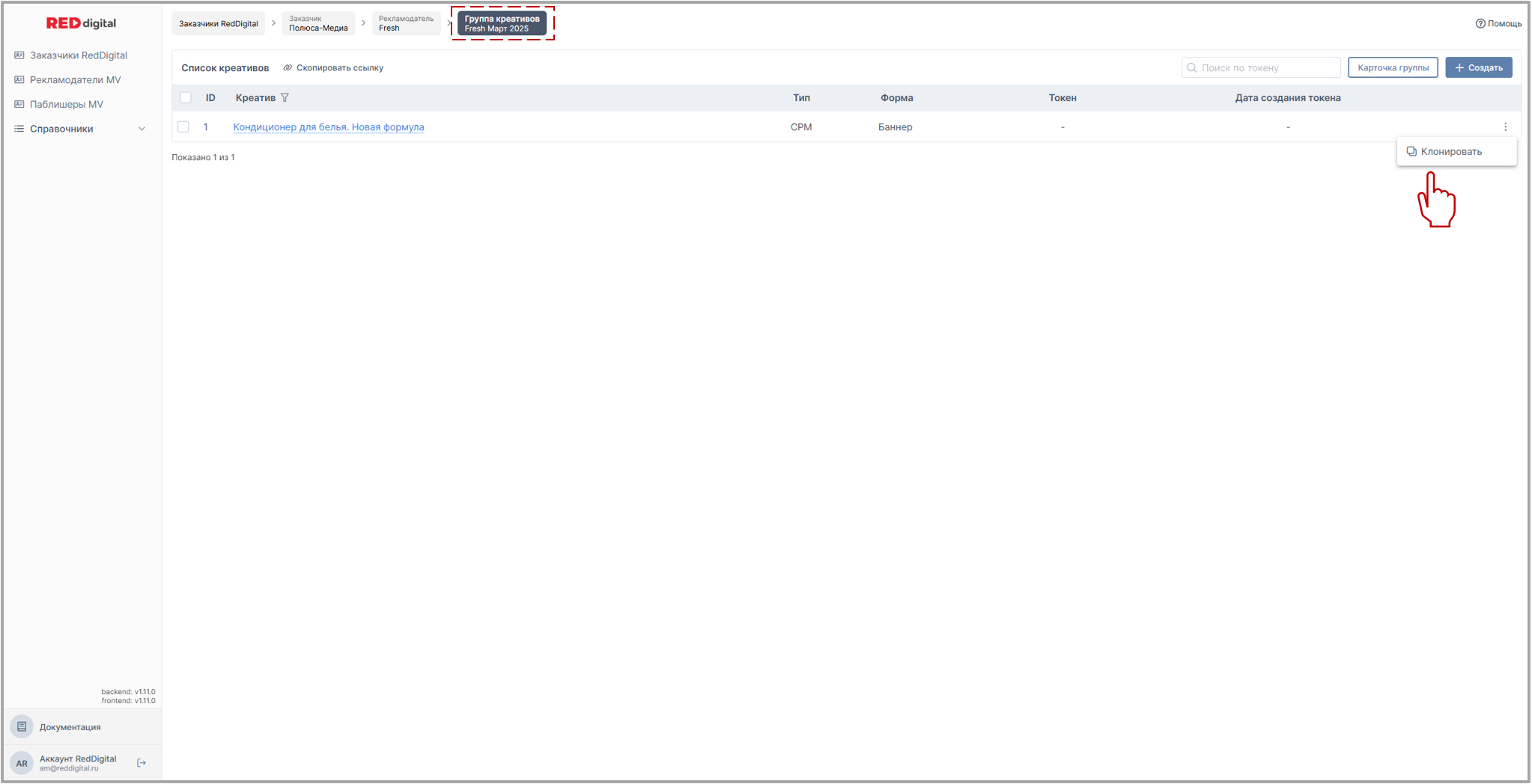 - Выполняется через кнопку 🚦 контекстного меню во вкладке Креативы.