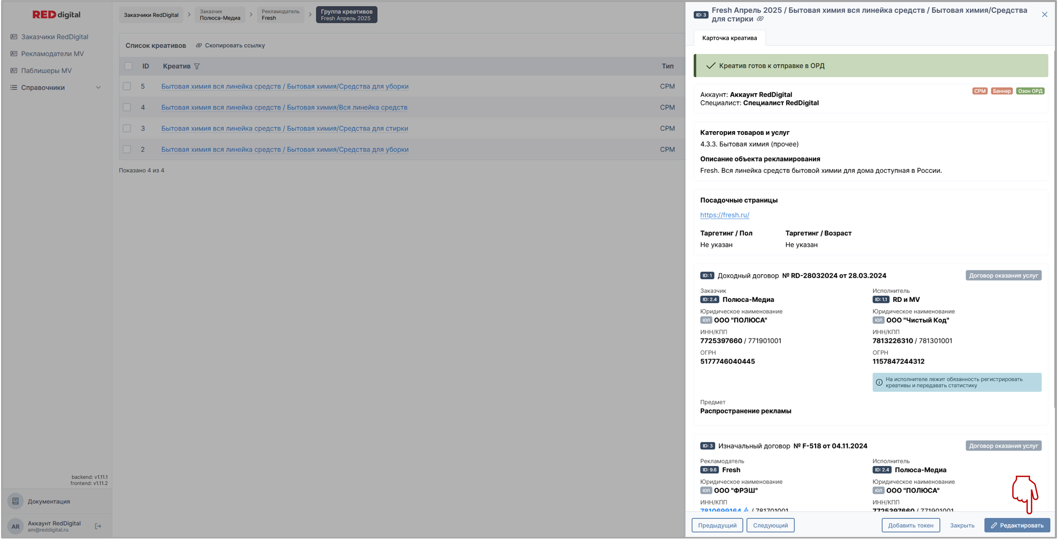 Если на креатив выпущен токен и / или рекламная кампания была запущена, к редактированию нужно подходить с особым вниманием. Так как данные уже ушли в ЕРИР, а любая корректировка это фиксация исправления ошибок которая отражается в истории изменений.