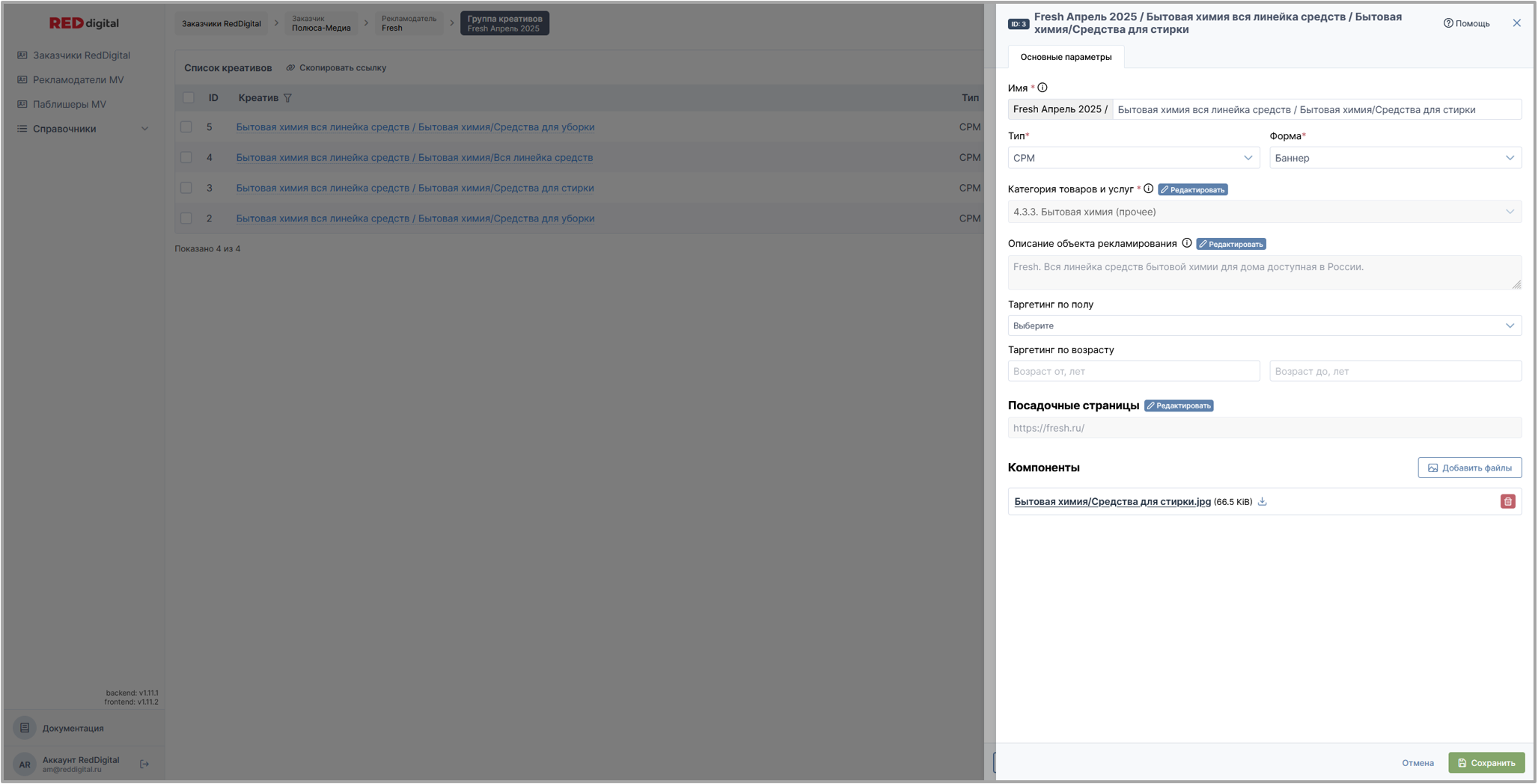 Открывается редактор карточки креатива для внесения необходимых изменений.