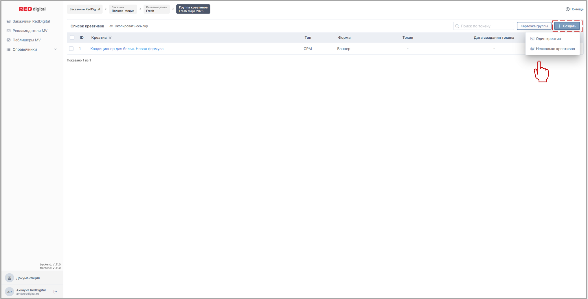 Через кнопку Один креатив и подразумевает выпуск одного токена на все погруженные креативы. Подробнее