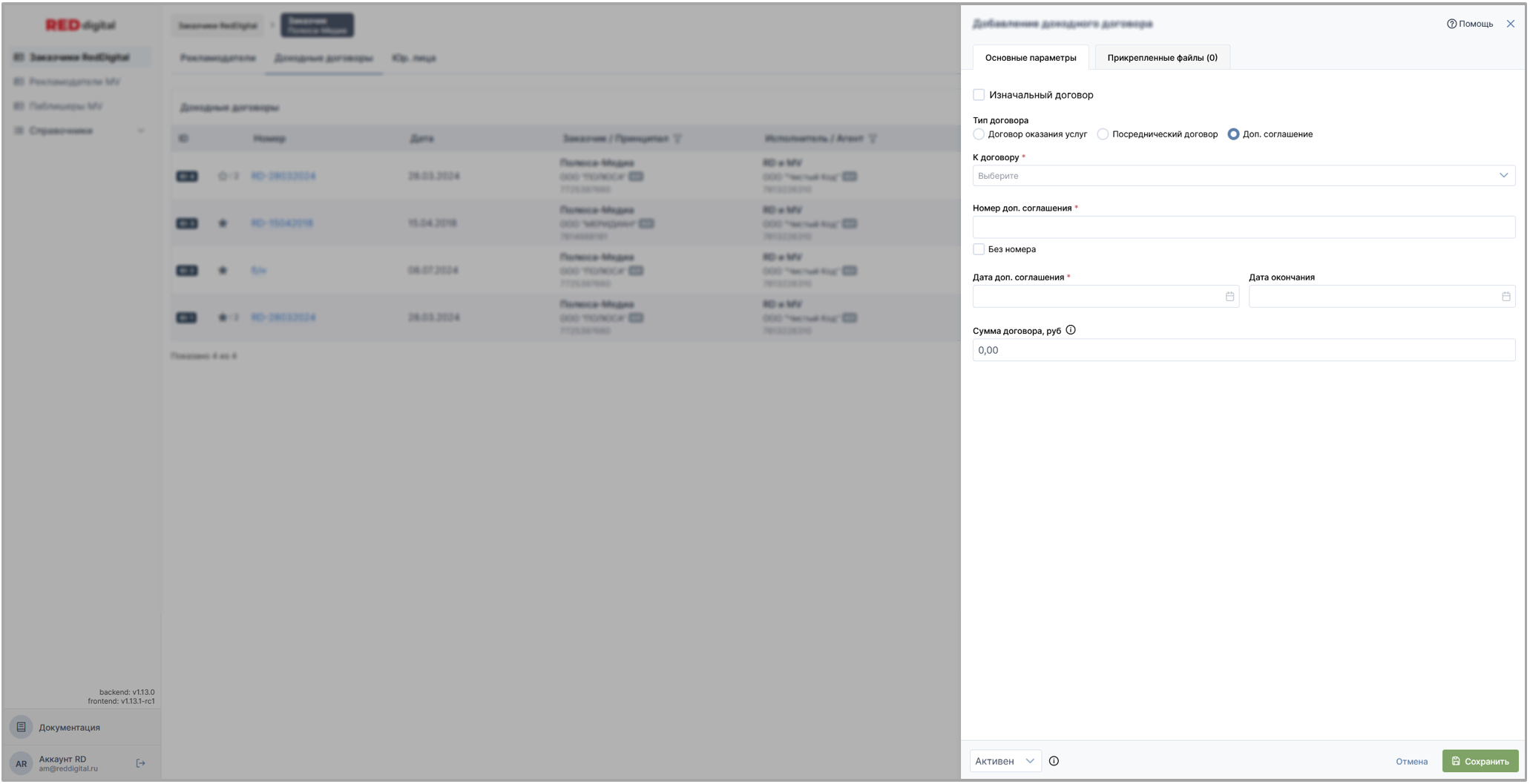 • Поля для ввода Номер доп. соглашения, Дата доп. соглашения являются обязательными для заполнения.