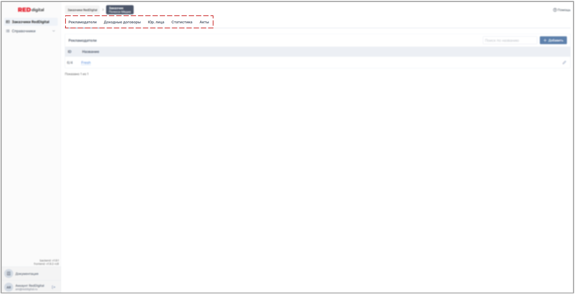 - Кнопка перехода в раздел Заказчики RedDigital представленная в виде стартовой страницы по умолчанию.