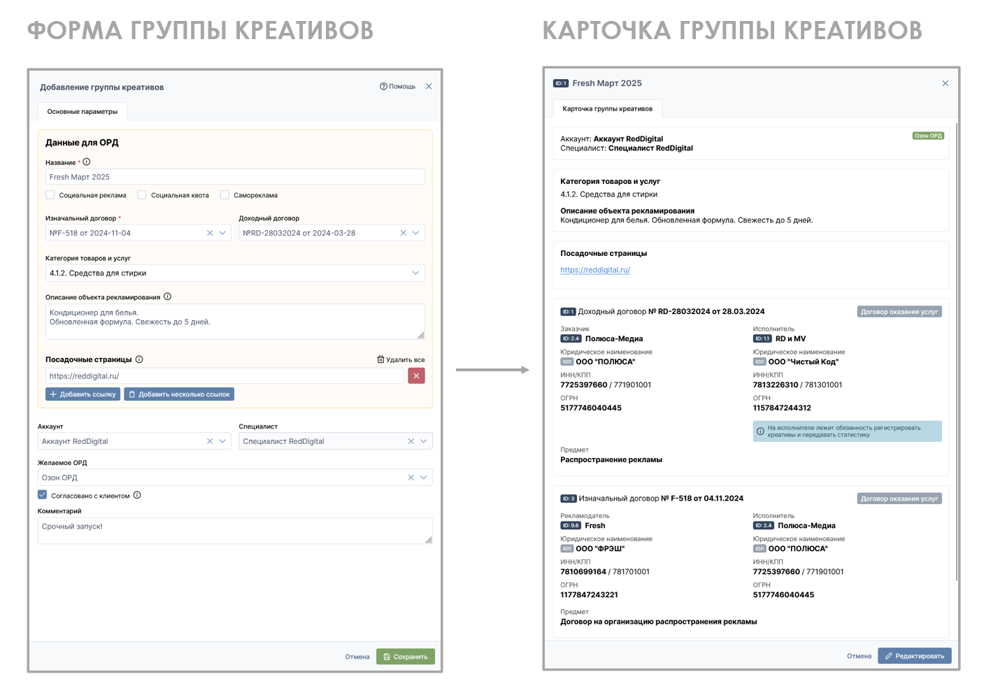 Карточка креатива - это графическое преобразование заполненной ранее формы креатива в завершенный табличный вид, со сгруппированной логически информацией, выделенными данными для удобства проверки компонента на предмет соответствия юридическим требованиям, проставленными тегами, возможностью быстрого перехода от одного креатива группы к другому при наличии, уведомлениями от системы о готовности или не готовности к отправке в ОРД, кнопками Получения или Добавления токена, кнопкой перехода в режим редактирования.