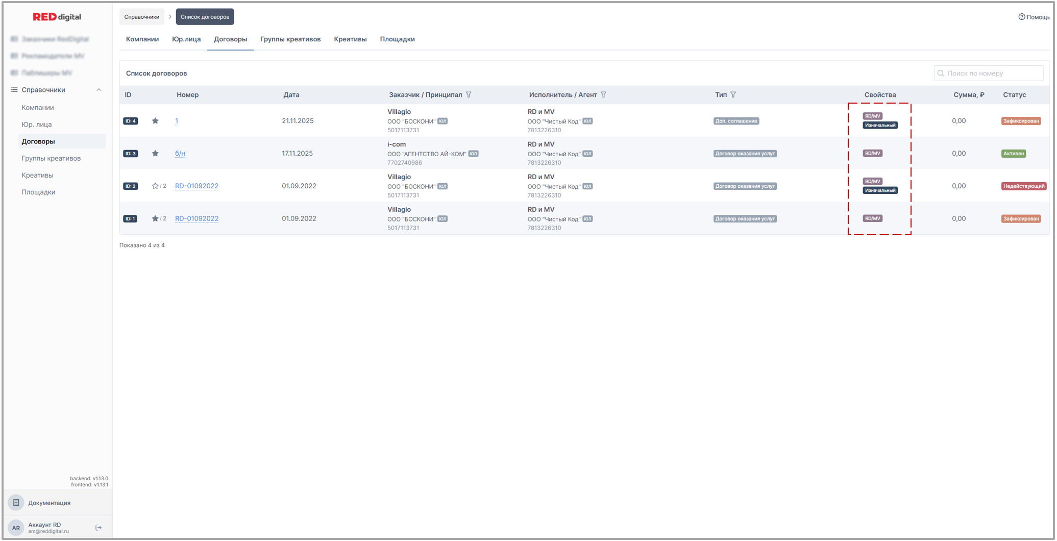 Свойства - это небольшие информационные элементы пользовательского интерфейса о том кем договор внесен в систему и об изначальности договора.