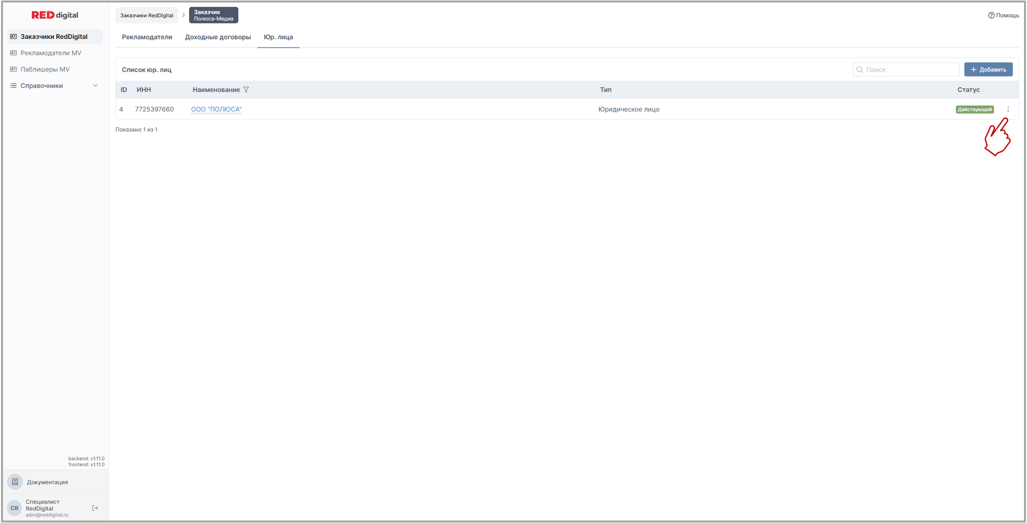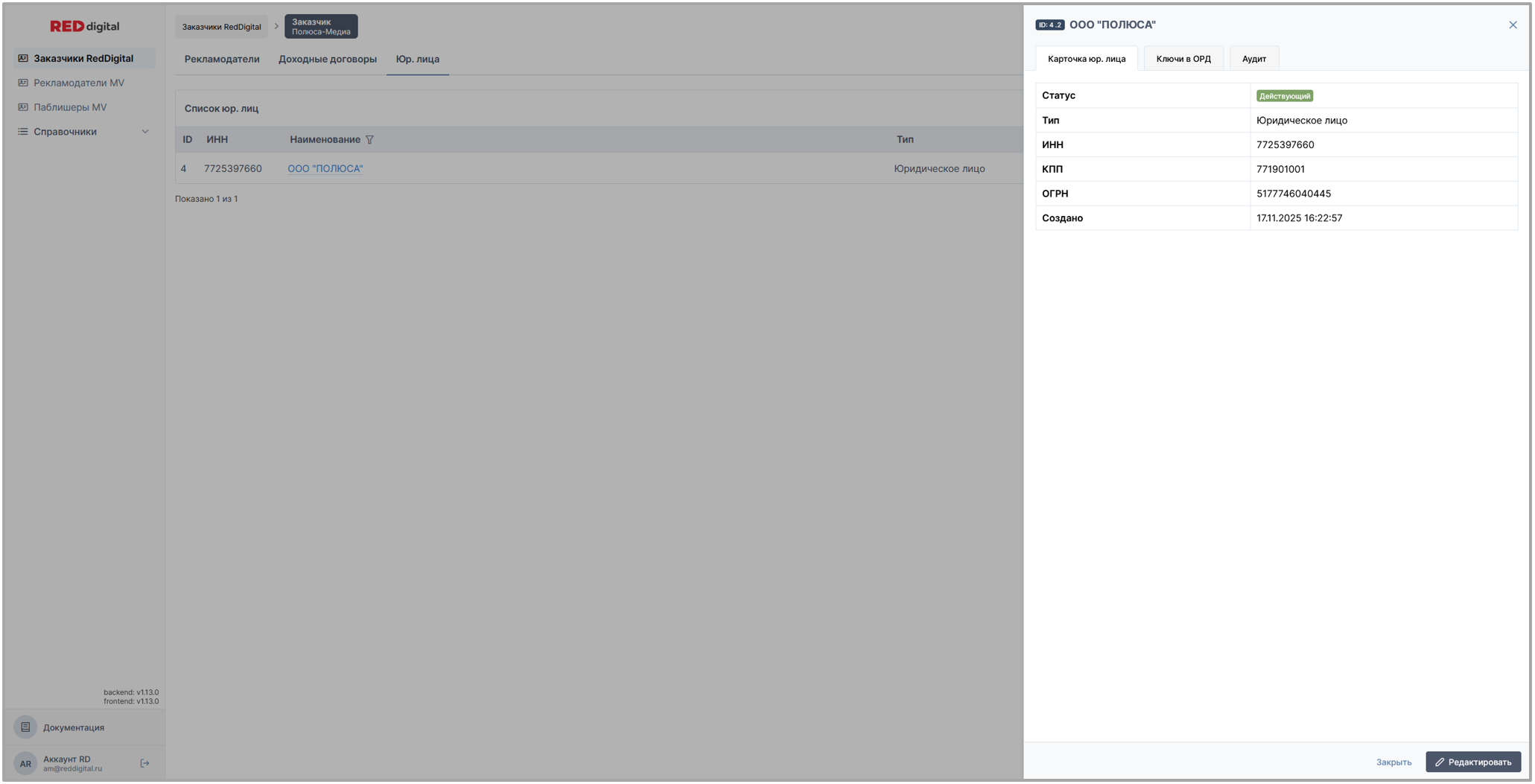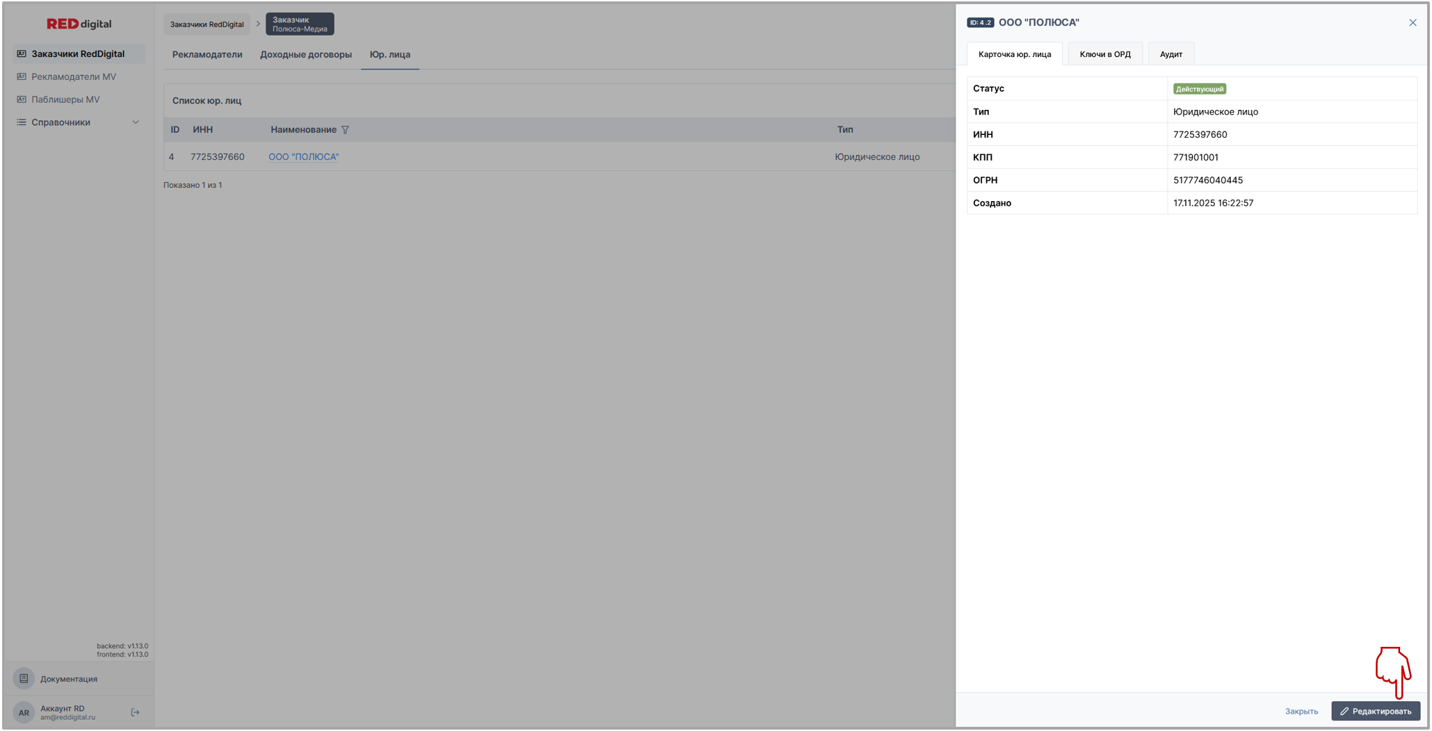 на скрине: раздел Заказчики Red Digital / вкладка Юр. лица заказчика