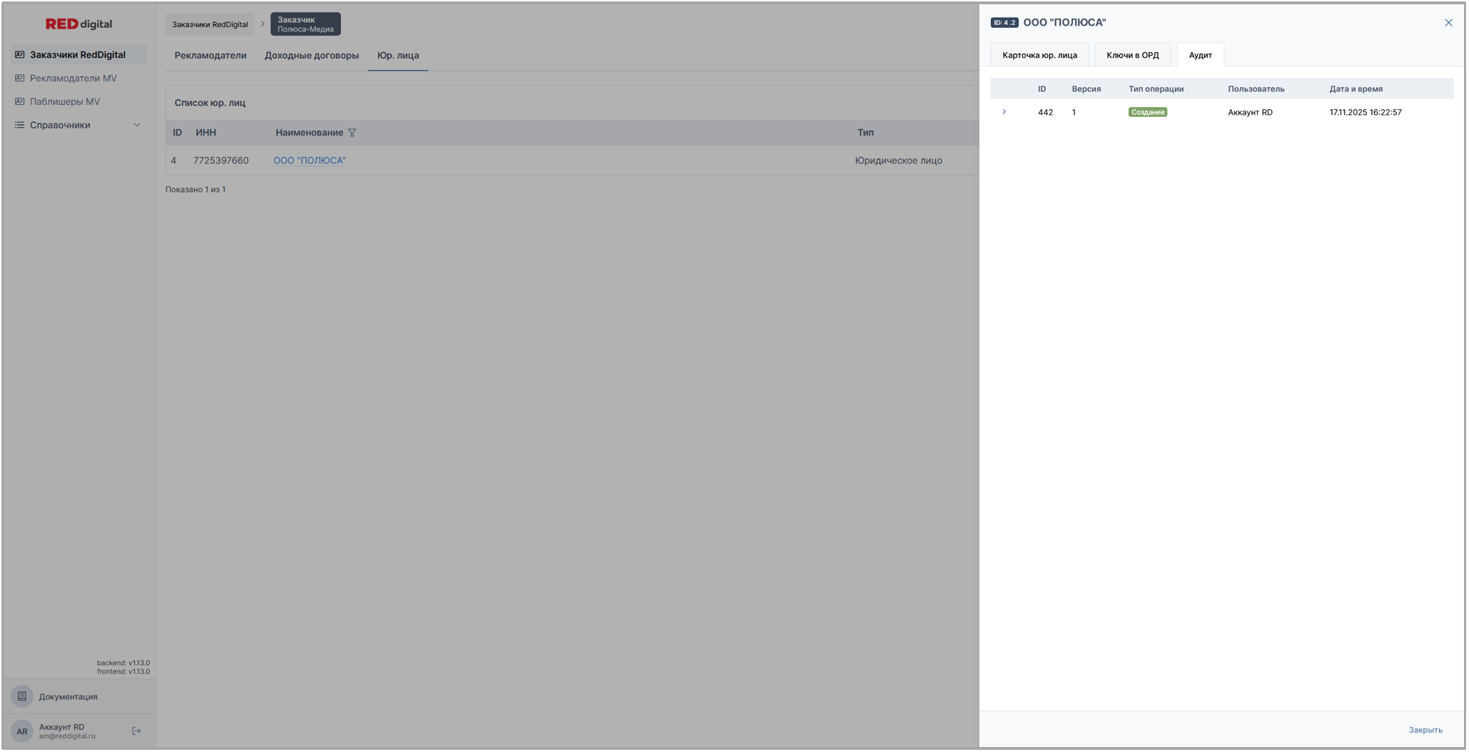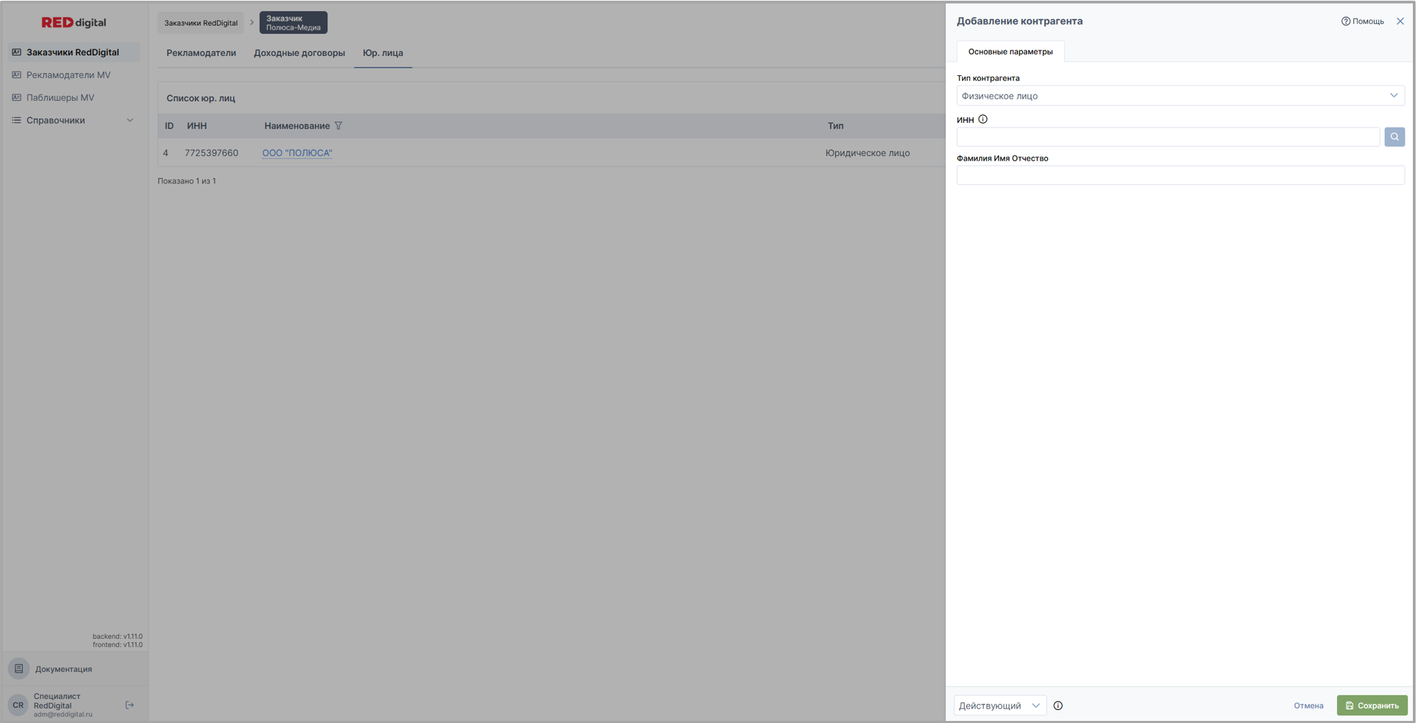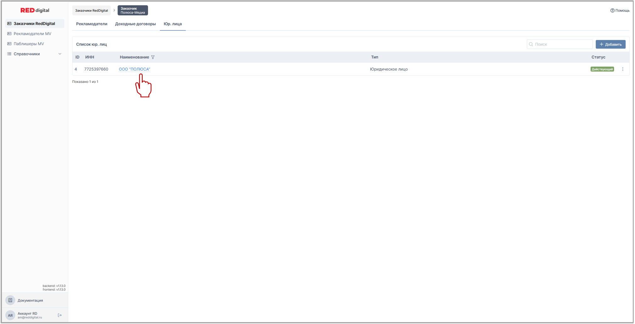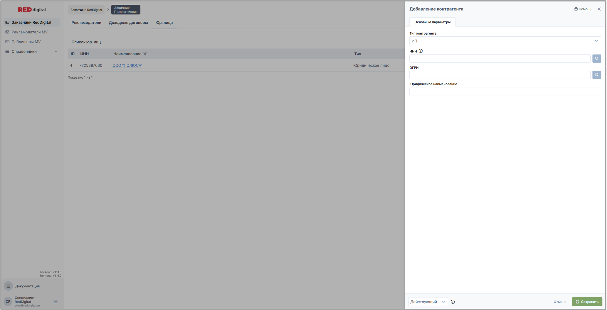 на скрине: раздел Заказчики Red Digital / вкладка Юр. лица заказчика