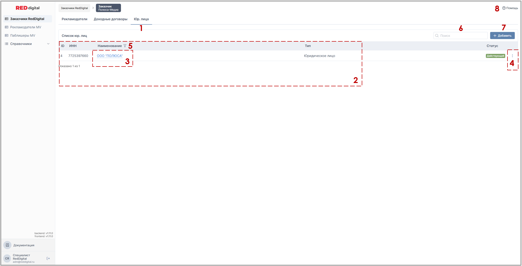 7. Кнопка добавления нового юридического лица.