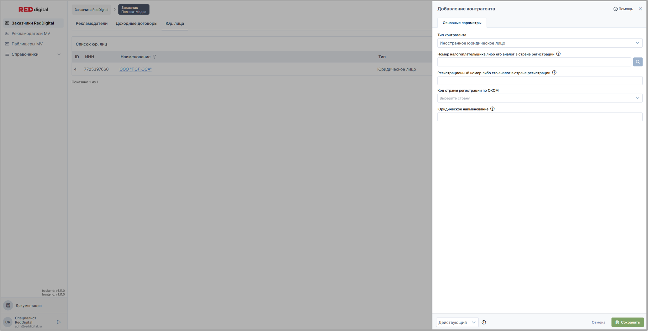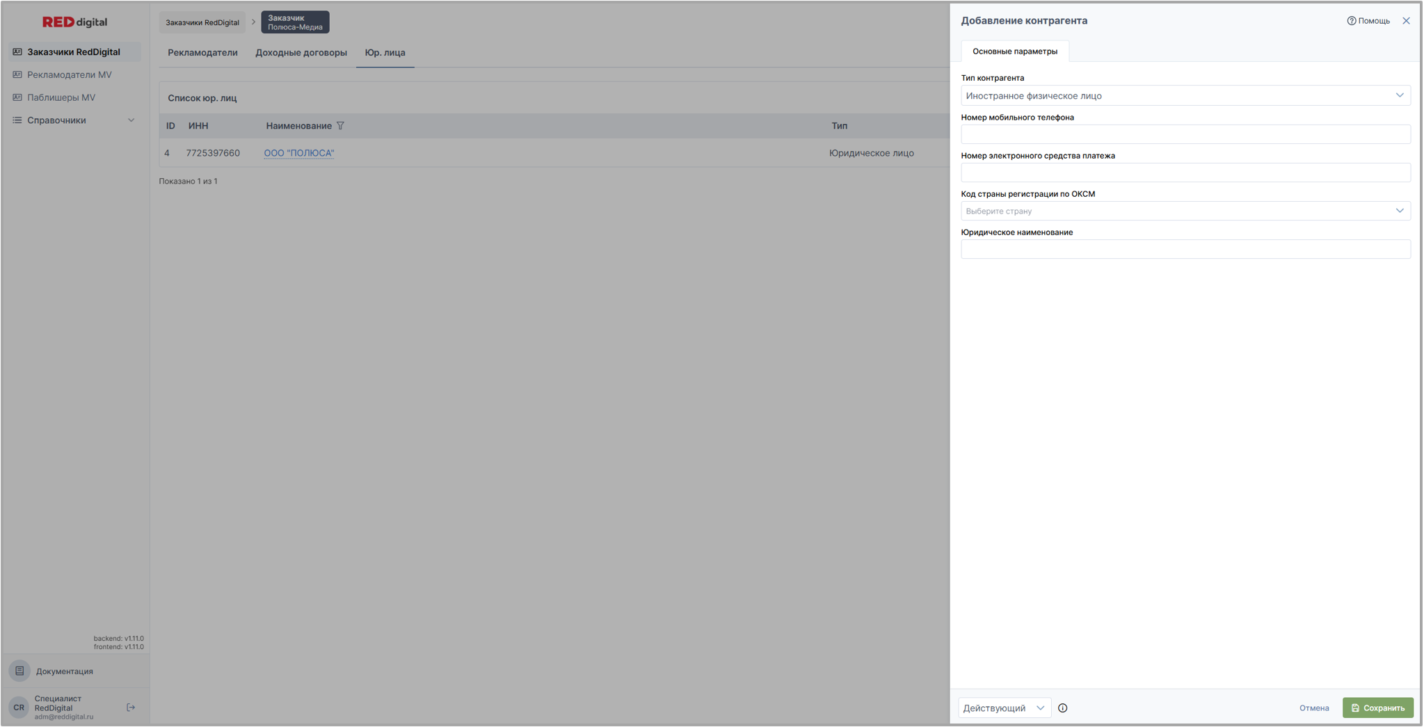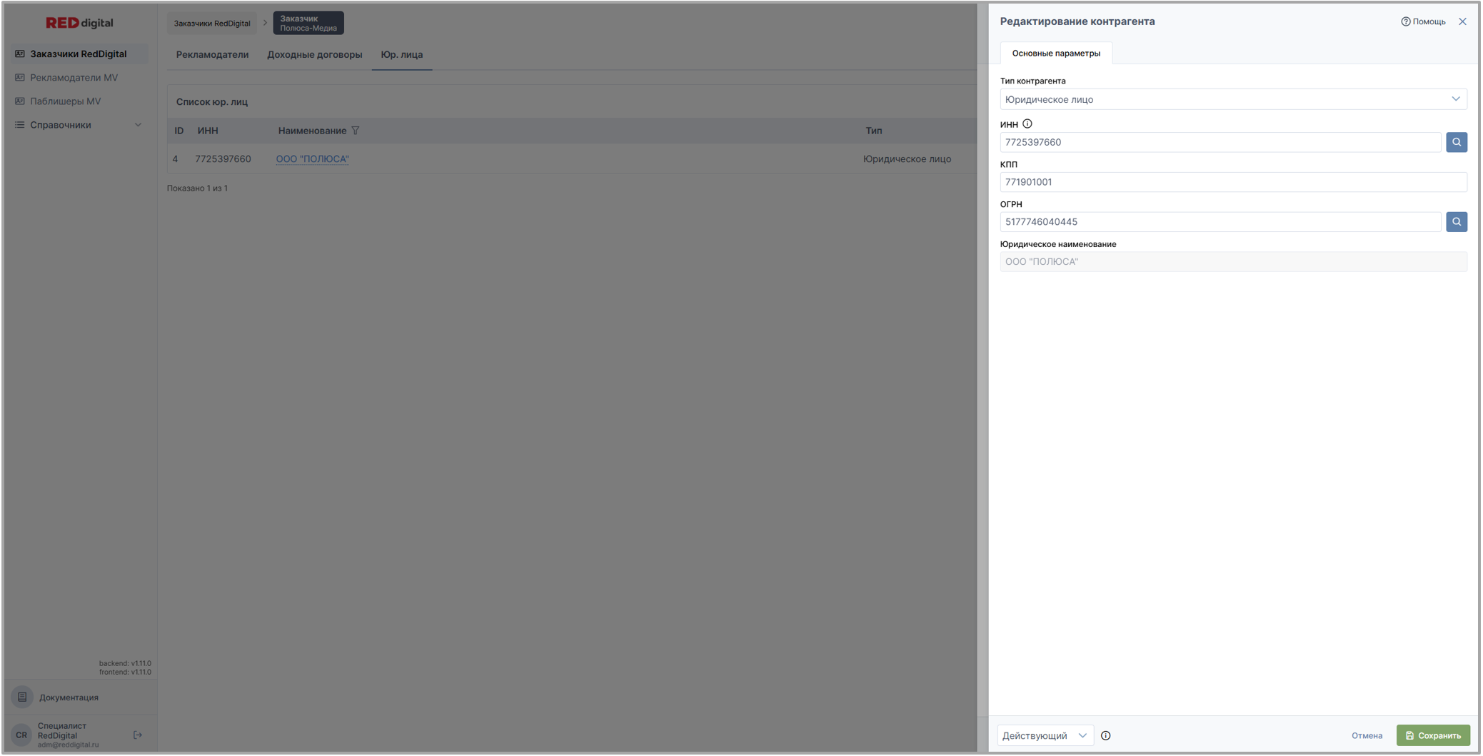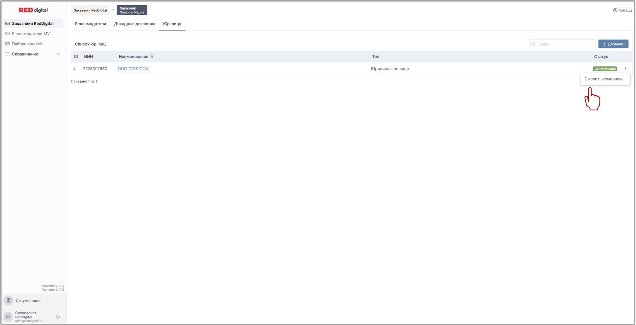 Вкладки Юр. лиц располагаются в разделе Заказчики Red Digital у заказчика и рекламодателя; в разделе Рекламодатели MoeVideo у рекламодателя; в разделе Паблишеры MoeVideo у паблишера.