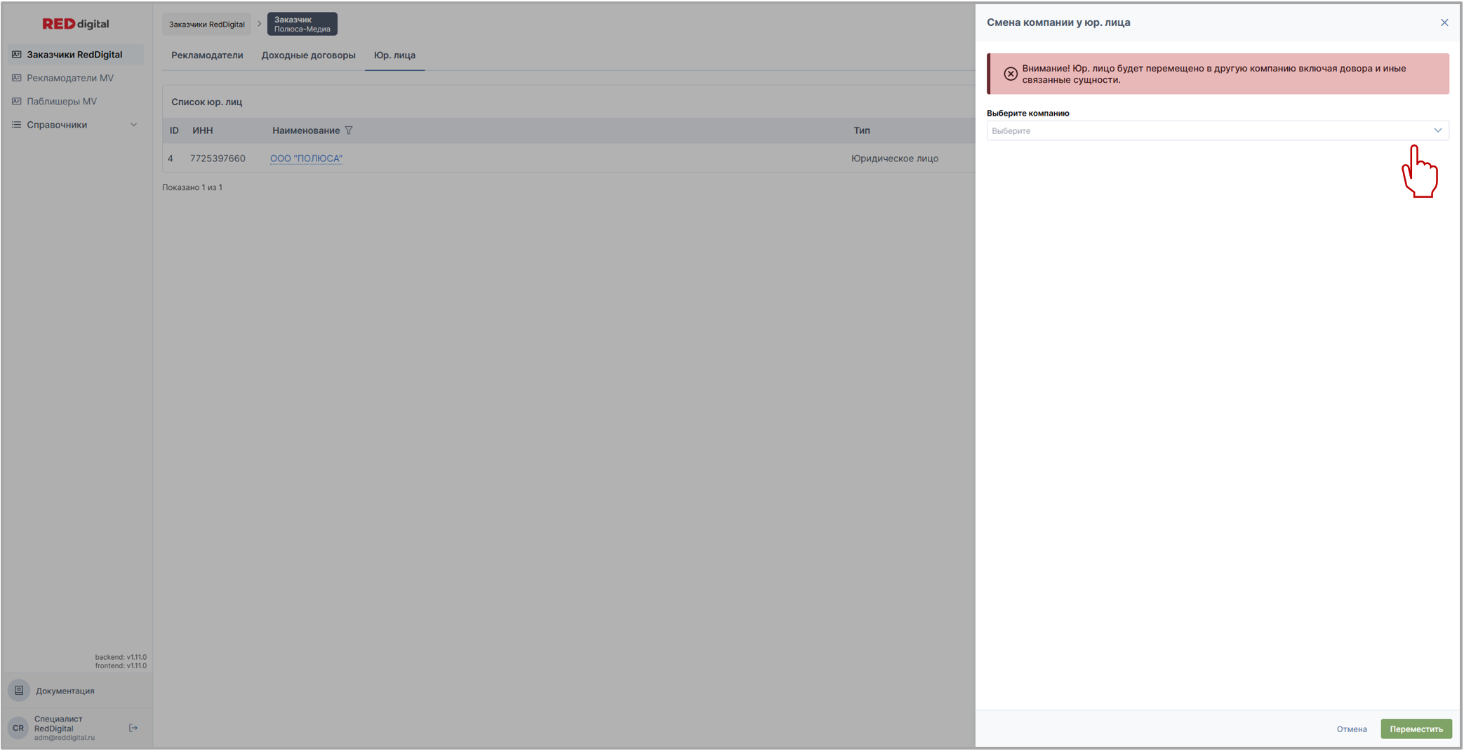 • Кнопка Переместить меняет компанию юридического лица.
