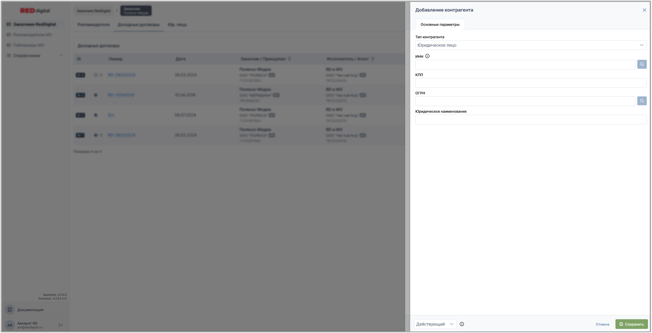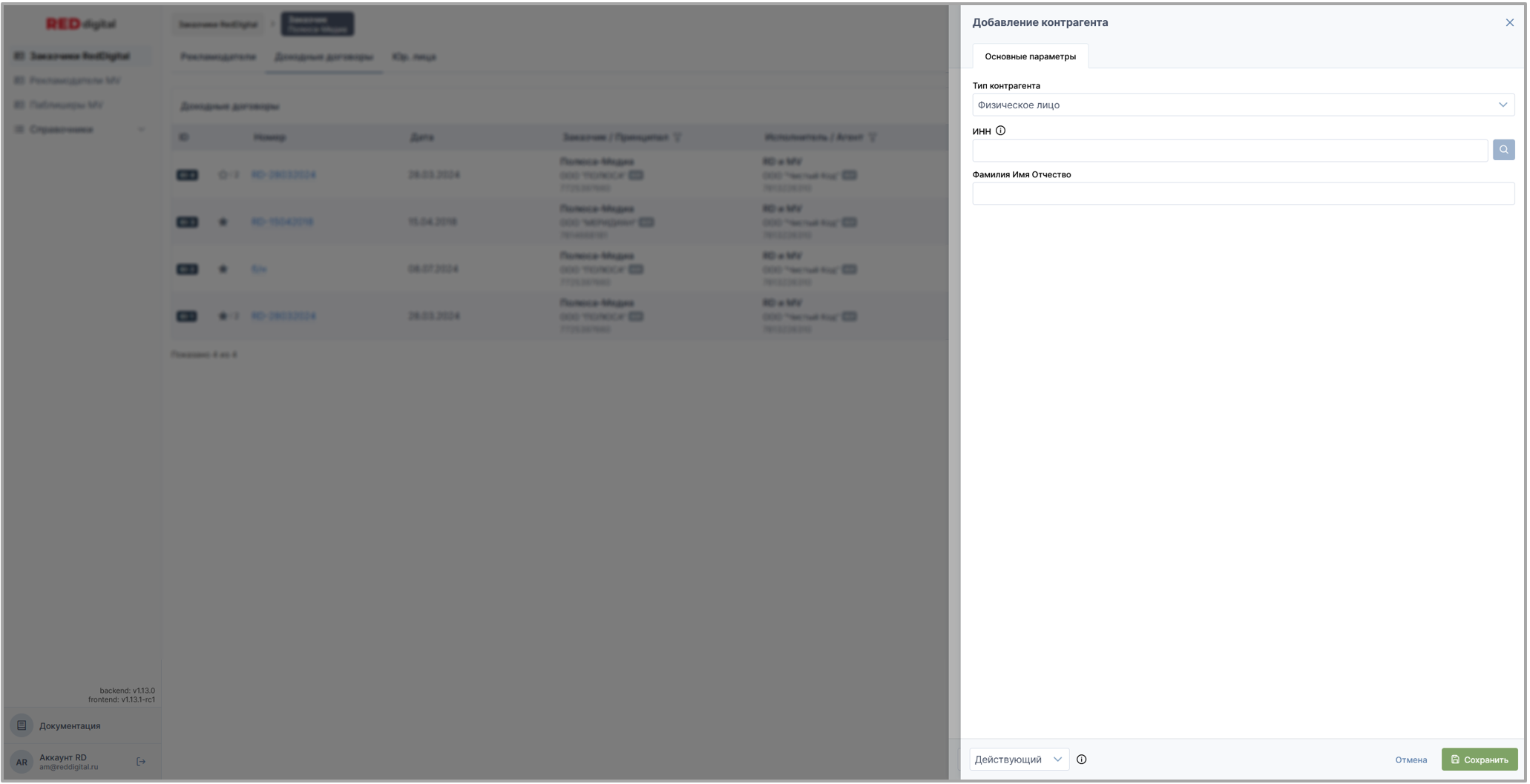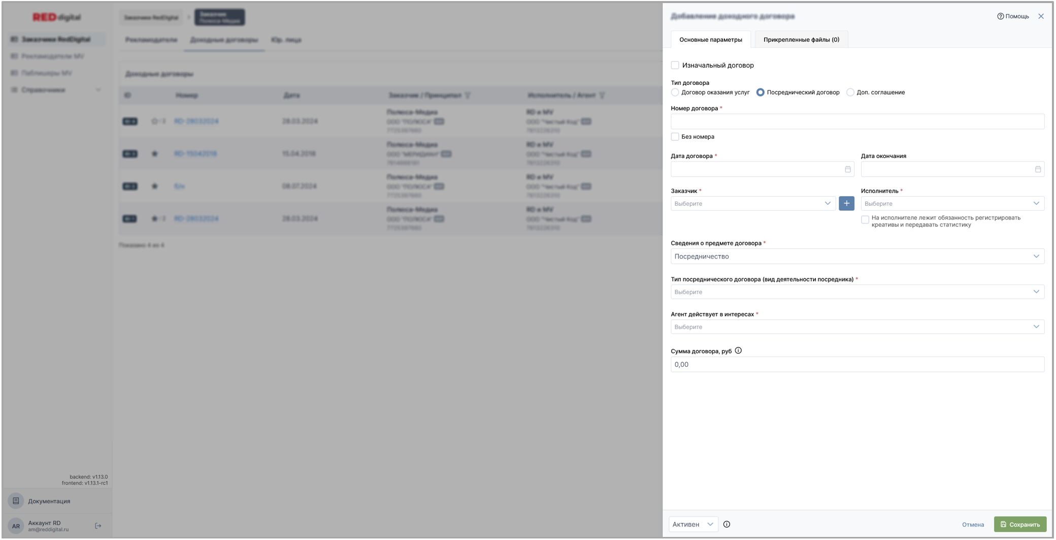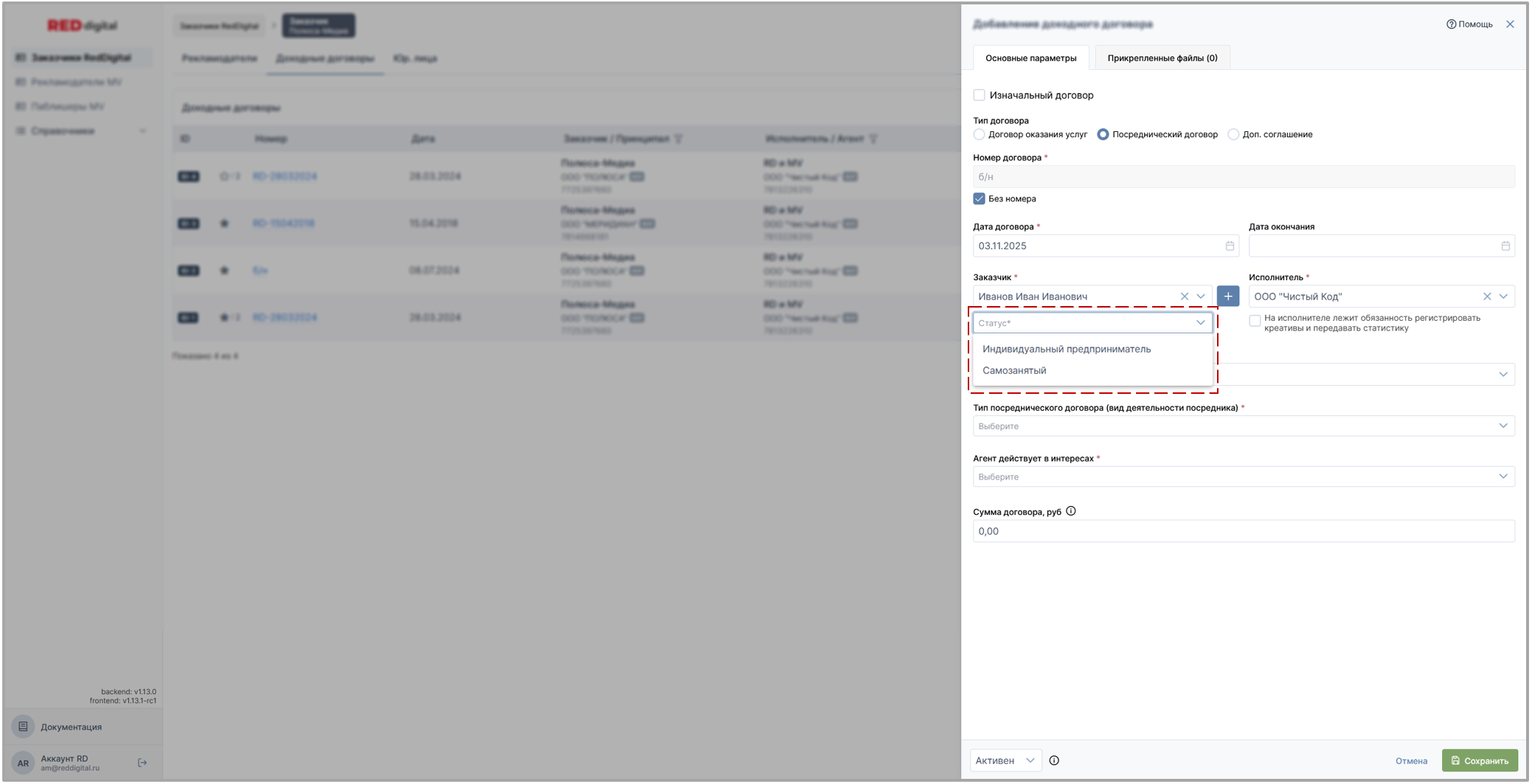 • Раздел Заказчики Red Digital: доходные и доходые (изначальные) договоры