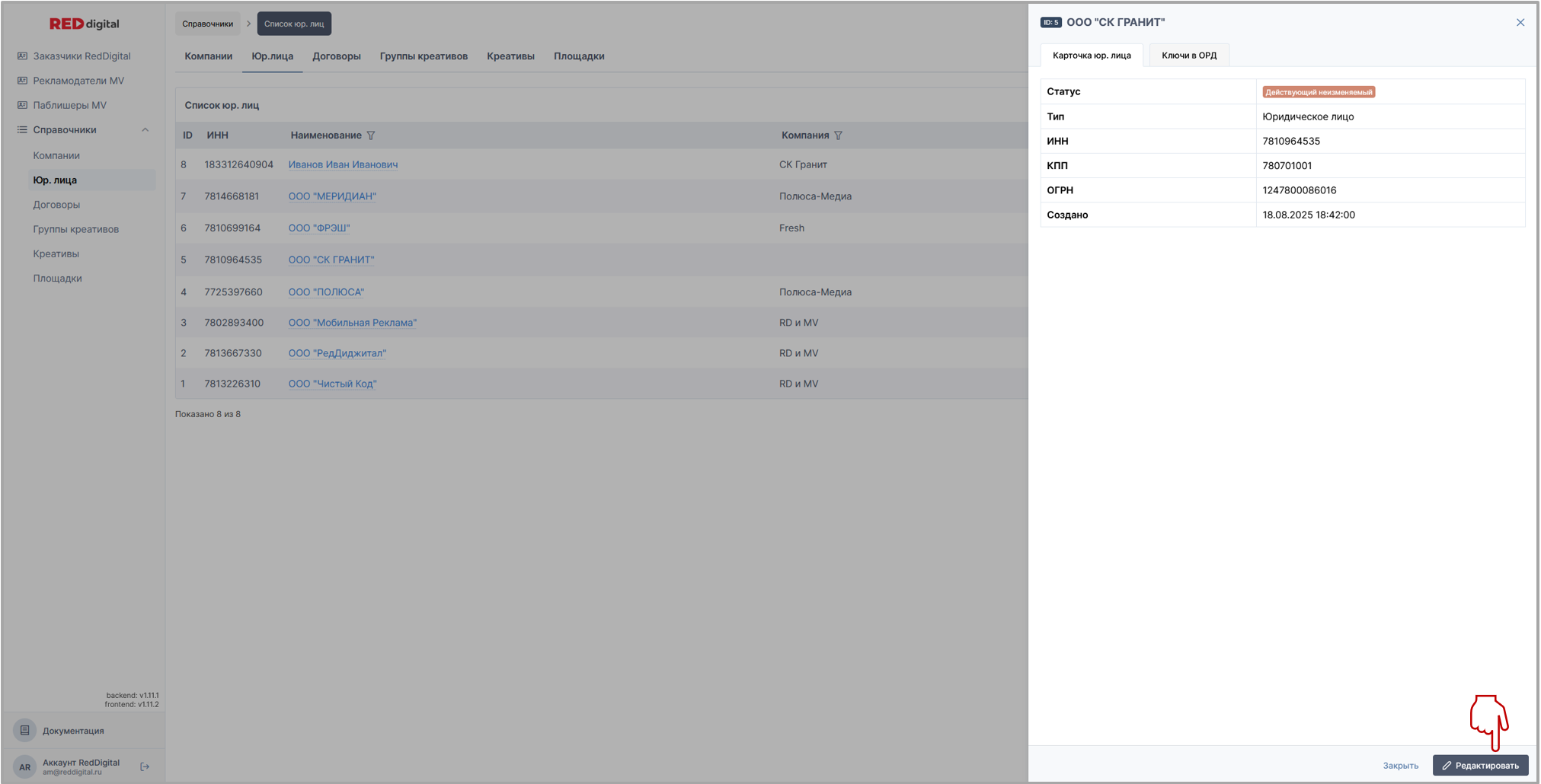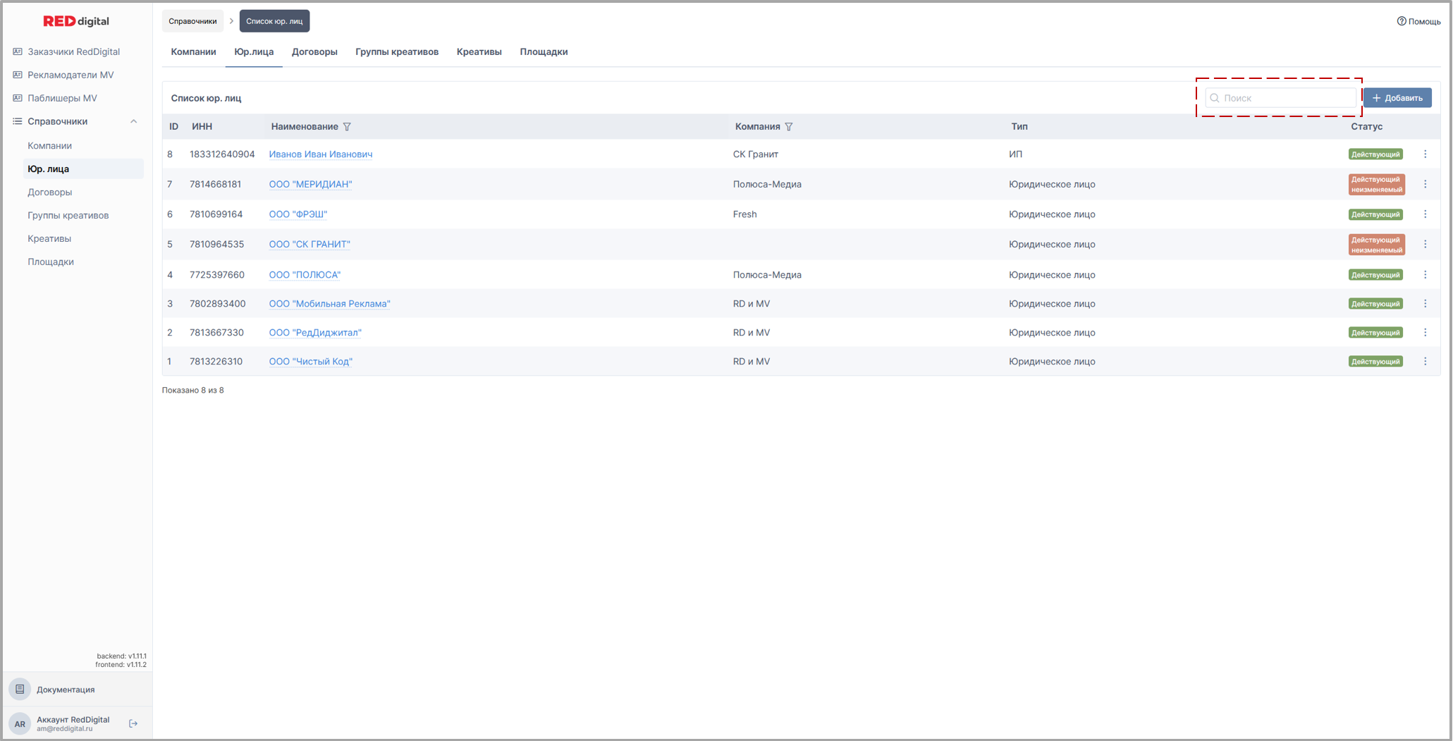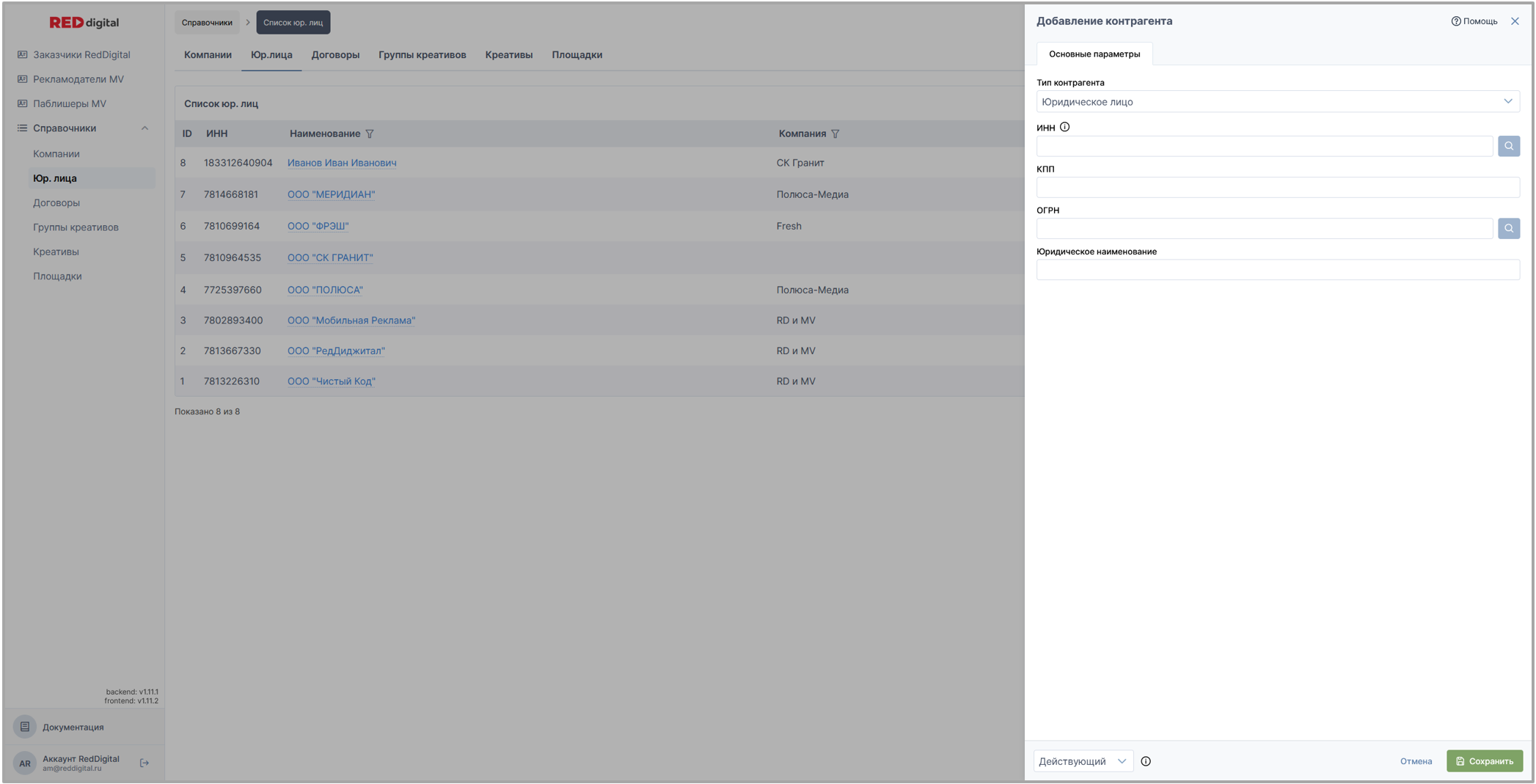 Вкладка представляет собой список всех юридических лиц заказчиков и рекламодателей заведенных в систему.