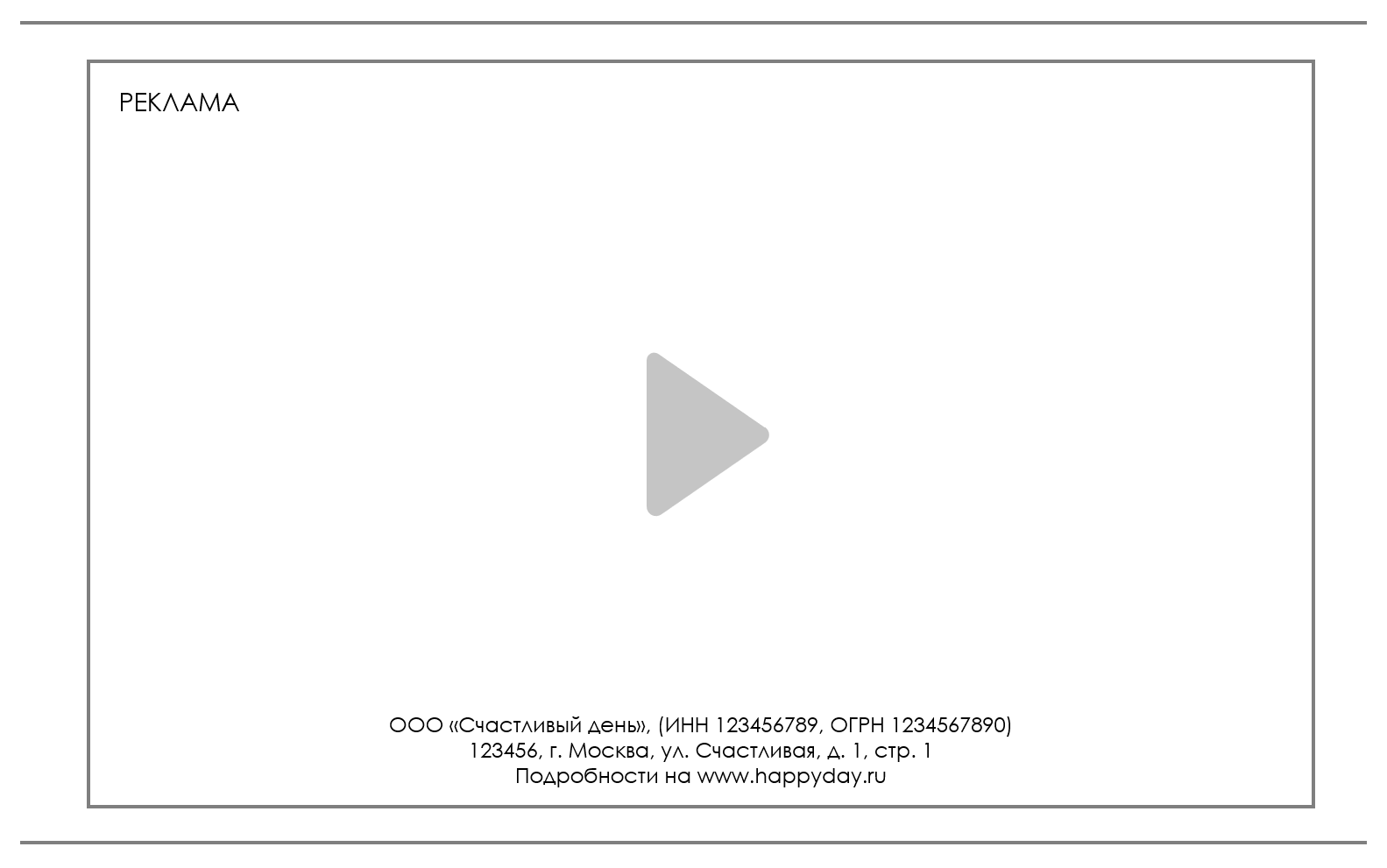 - Пометка «Реклама», Рекламодатель: ООО «Счастливый день» (ИНН 123456789, ОГРН 1234567890)